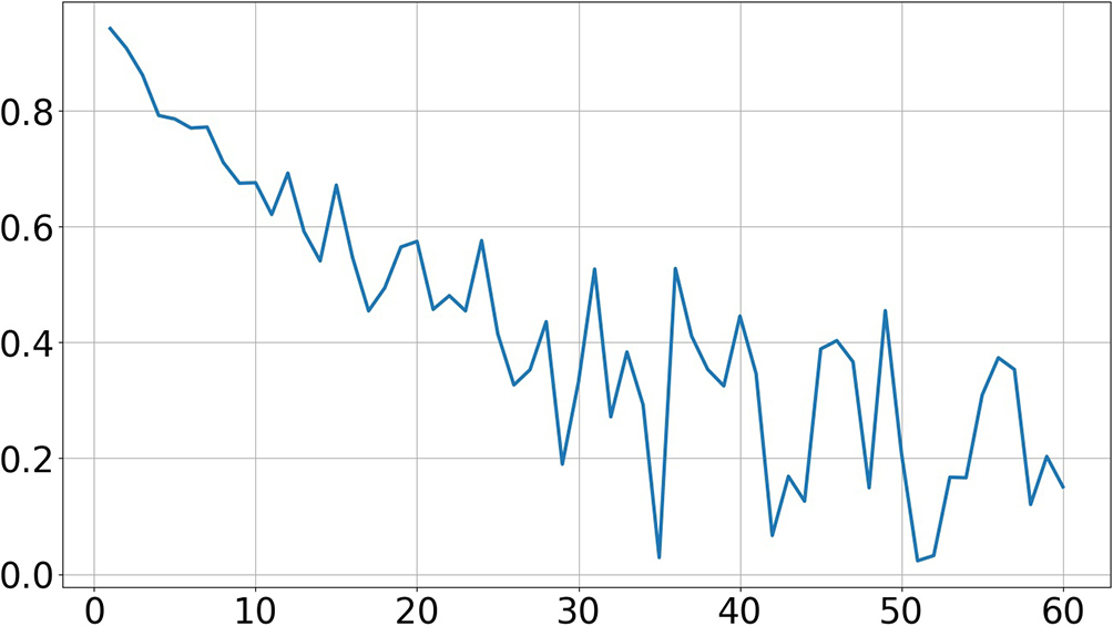Были рассчитаны коэффициенты корреляции для инерционного прогноза с заблаговременностью от 1 до 60 месяцев. Наблюдаются более высокие коэффициенты корреляции, чем для модельного прогноза. Как видно из рис. 6, при увеличении заблаговременности коэффициент корреляции начинает колебаться между 0.4 и 0.0.