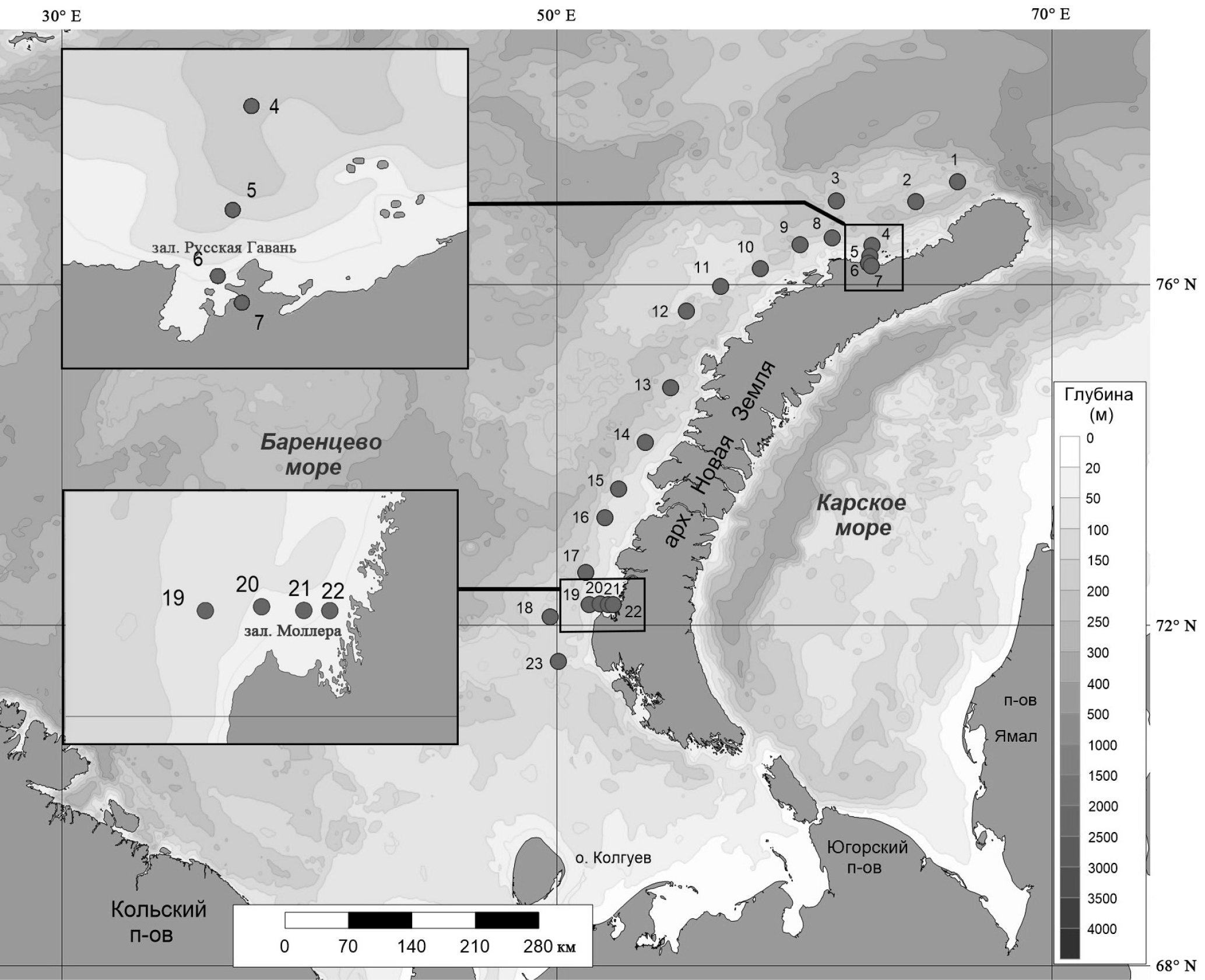 Прибрежные экосистемы являются основными экологическими посредниками в системе взаимодействия суши и открытых морских акваторий. Именно здесь происходит процесс первичного накопления и трансформации вещества, поступающего с речным и береговым стоком, формирующий высокий продукционный потенциал прибрежных зон. При этом уровни видового разнообразия и продукционных характеристик экосистемы прибрежных вод зависят от значительных межгодовых колебаний гидрологических характеристик водных масс [3]. Несмотря на длительность проводящихся в Баренцевом море биоокеанологических исследований и обилие полученных в них данных, комплексных экосистемных наблюдений структурных и функциональных параметров прибрежных зон архипелагов остается крайне немного, и по своему составу они мало информативны [6]. Так, например, работы по изучению рыбного сообщества Баренцева моря главным образом приурочены к промысловым районам и практически не затрагивают прибрежные зоны. А комплексные исследования пелагических и бентосных сообществ в основном связаны с центральной частью и прибрежьем Кольского полуострова.