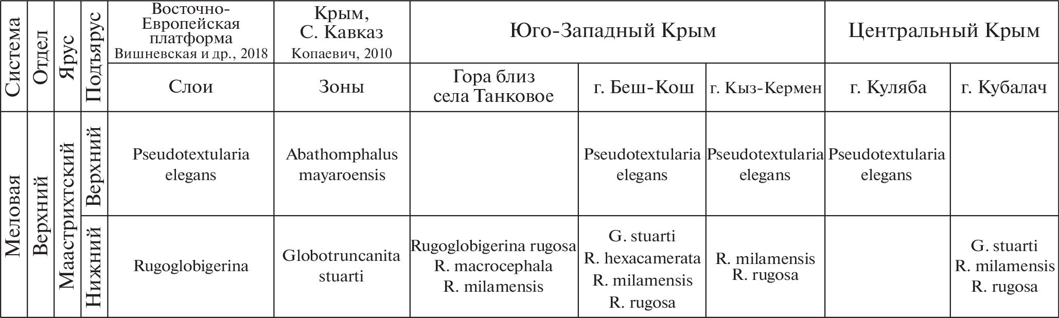 Planktonic foraminifers are widely distributed in the Upper Cretaceous deposits of the Mountainous Crimea. Marker species are of great importance for biostratigraphy and section correlation. Tests Globotruncanita stuarti (De Lapparent, 1918) and Pseudotextularia elegans (Rzehak, 1891) are used as index species for local and regional biostratigraphic scales, and tests of the genus Rugoglobigerina Brönnimann, 1952 are for the faunal layers. The article provides a systematic description of important biostratigraphic species Pseudotextularia elegans (Rzehak, 1891), Rugoglobigerina rugosa (Plummer, 1927), R. hexacamerata Brönnimann, 1952, R. milamensis Smith and Pessagno, 1973, R. macrocephala Brönnimann, 1952 и Globotruncanita stuarti (De Lapparent, 1918), on the basis of which the age of the rocks of five sections of the Mountainous Crimea was determined.