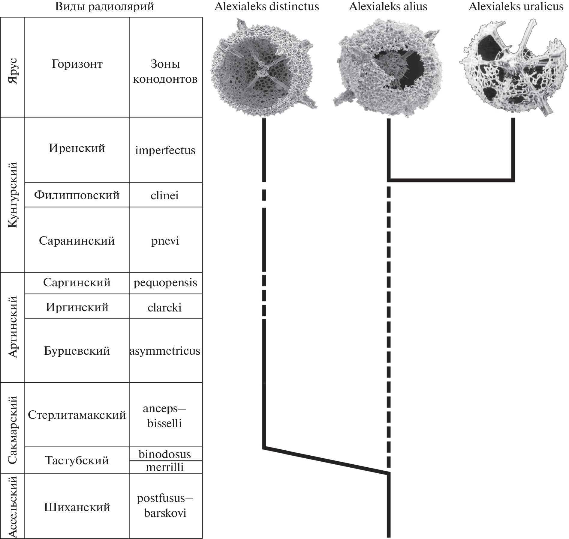 Analysis of the morphology of radiolarian skeletons from the Lower Permian of the South Urals made it possible to revise the taxonomic assignment of Helioentactinia uralica Kozur et Mostler, 1989 and two different morphotypes of Helioentactinia sp. and assign them to three species within the new genus Alexialeks gen. nov.: A. uralicus (Kozur et Mostler, 1989), A. alius sp. nov. and A. distinctus sp. nov. Three pathways are recognized in the evolution of Alexialeks gen. nov. in the Asselian, Sakmarian, Artinskian, and Kungurian (Early Permian). The diagnoses of the genus Multisphaera Nazarov et Afanasieva in Afanasieva, 2000, emend. nov. and subfamily Multisphaerinae Nazarov et Afanasieva in Afanasieva, 2000, emend. nov. are emended. The validity of the subfamily Multisphaerinae Nazarov et Afanasieva in Afanasieva, 2000, emend. nov. is confirmed. A hypothesis is proposed that a primary inner sphere with a rudimentary four-ray spicule and numerous rod-like spines may represent a transitional form of the internal framework of the skeleton from an n-ray spicule to a true microsphere.