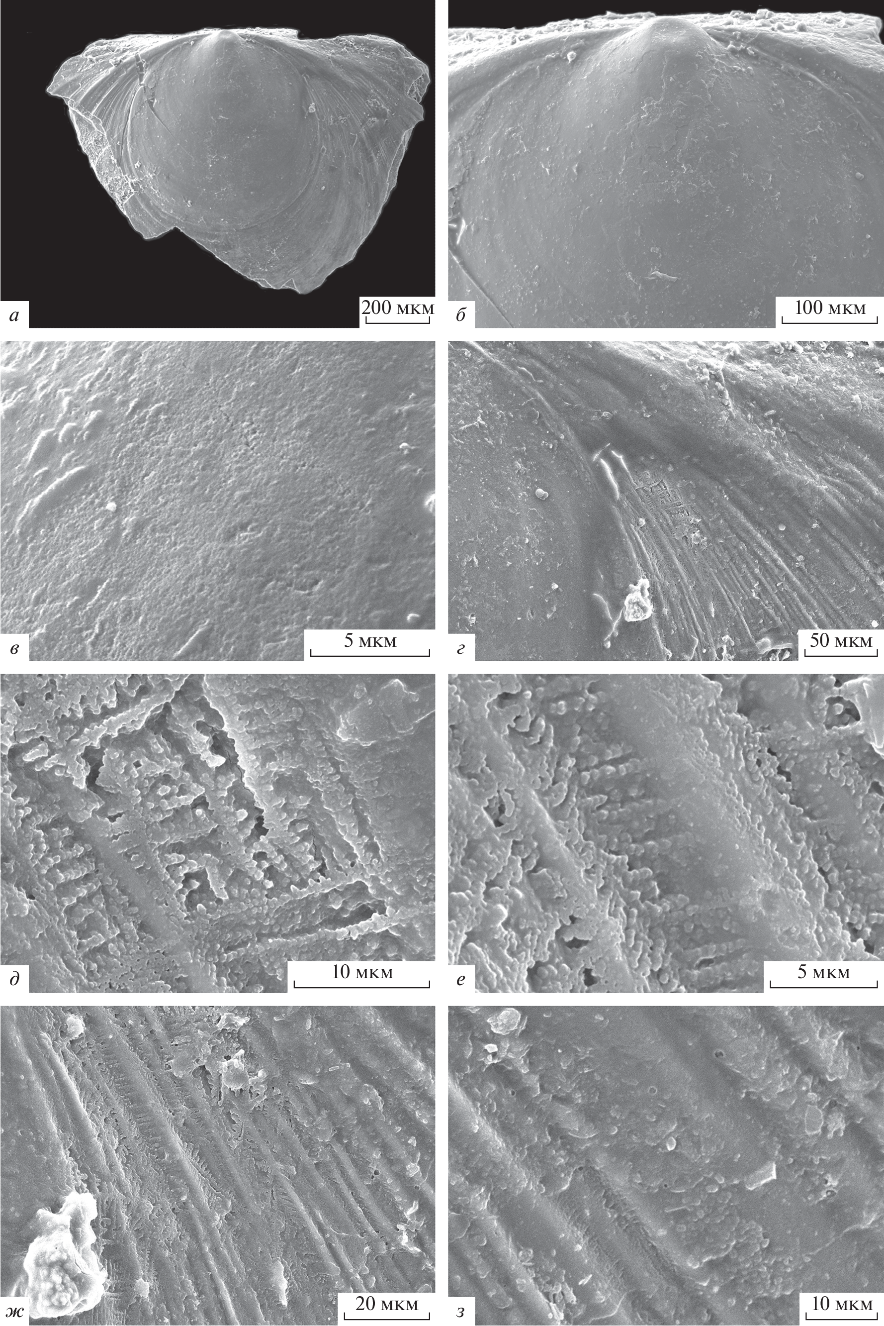 The structure and microstructure of the shell substance Acrotretella sp. on the protegulum, brephic and adult shell. The structure of the secondary layer, represented by interlayers with columnar-lamellar and spherulite structures, is characteristic. Wrinkles are developed along the edges of the shell.