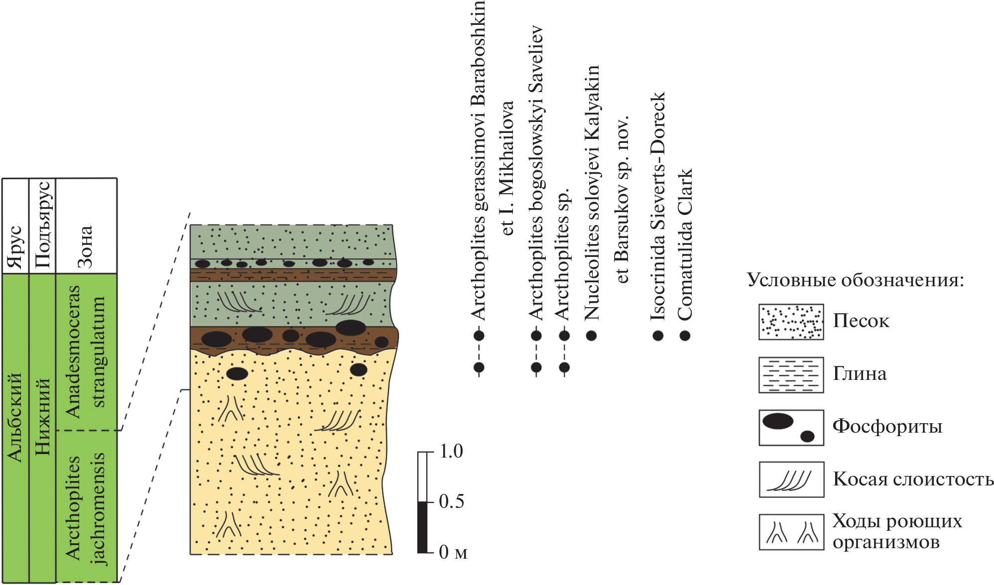 A new species of Nucleolites from the Lower Albian deposits (Arcthoplites jachromensis Zone) of the Pavlovskoye section (Yuriev-Polsky district, Vladimir region) was described based on eight specimens. The species characterizes the late stages of the phylogeny of the genus and significantly expands its paleogeography. The taphonomic features of the burial made it possible to trace the structure of the jaw apparatus of the cassiduloid type in adult Nucleolites. For the first time in the Albian deposits of the Russian Plate, an extensive echinoderm assemblage, which is the most representative for the Lower Cretaceous deposits of the region as a whole, was established.