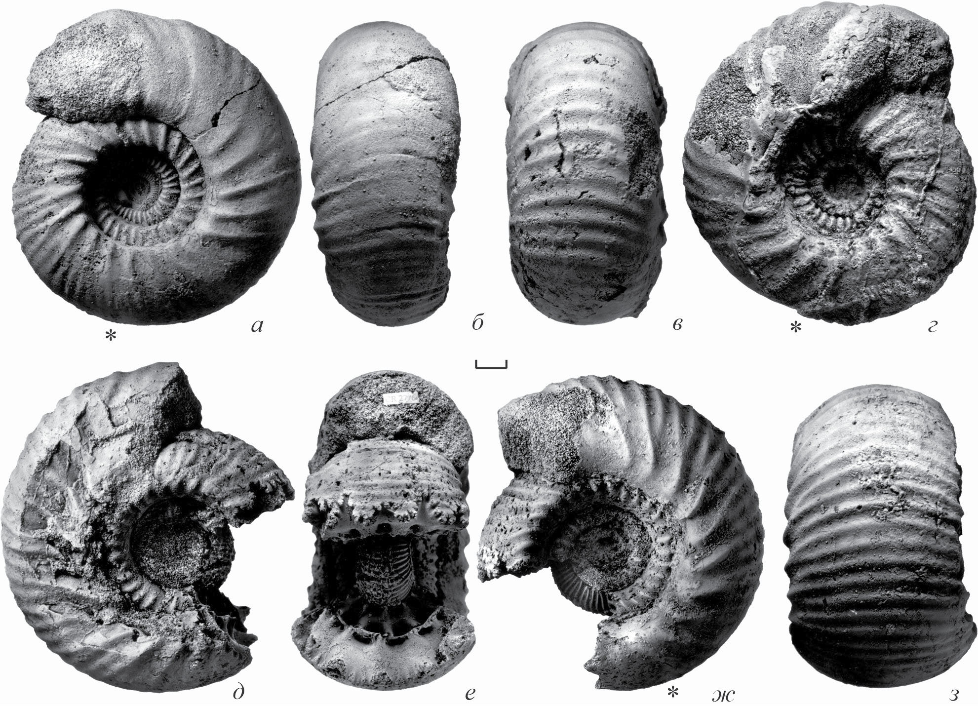 Рис. 6. Pseudocadoceras ex gr. mundum (Sasonov) (микроконхи Cadoceras falsum Voronetz) сбоку и с вентральной стороны: а, б – экз. ПИН, № 5029/193; в, г – экз. ПИН, № 5029/191; д, е – экз. ПИН, № 5029/194; ж, з – экз. ПИН, № 5029/190; и, к – экз. ПИН, № 5029/163; л, м – экз. ПИН, № 5029/192; Чувашия, Порецкий р-н, карьер у с. Порецкое; нижний келловей, зона Elatmae, фаунистический горизонт falsum. Длина масштабной линейки 10 мм; звездочкой (*) отмечено начало жилой камеры.