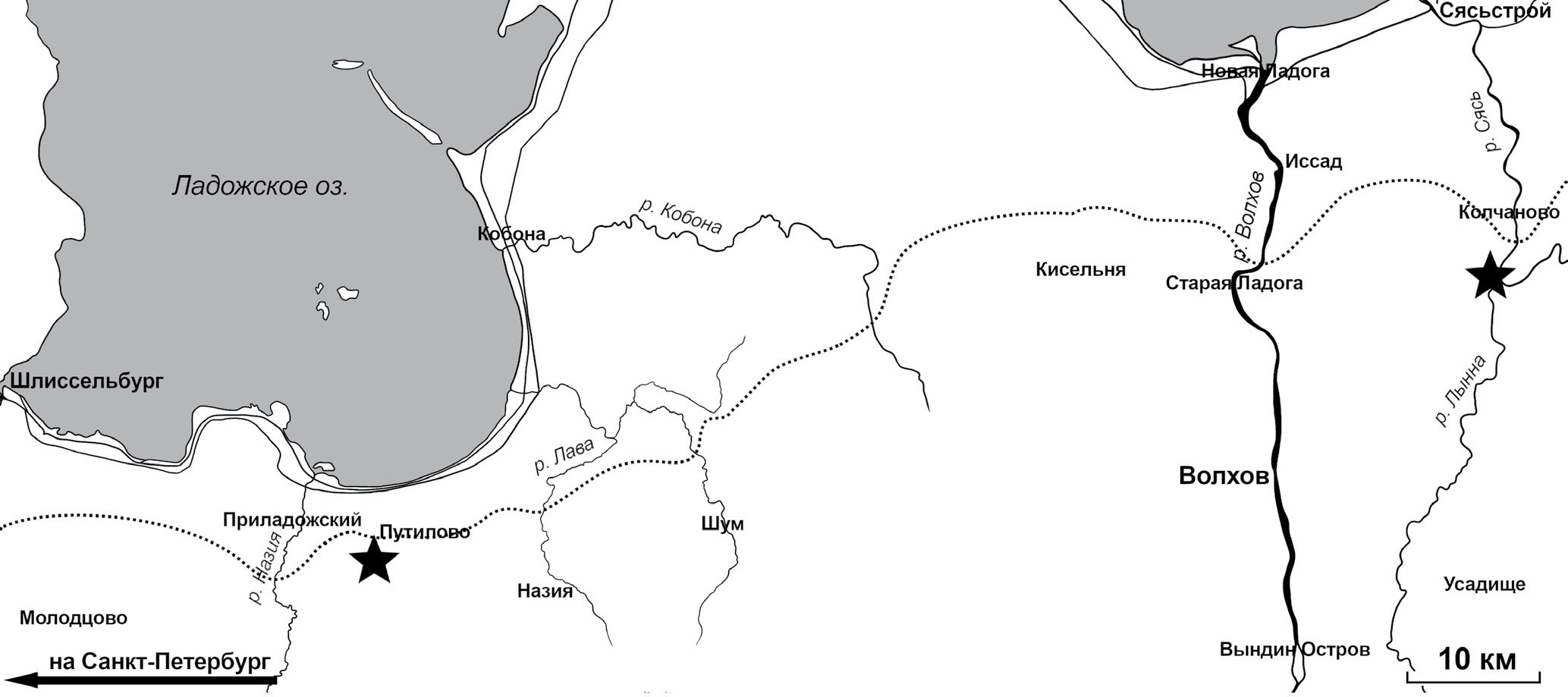 Рис. 1. Карта Ленинградской обл. к востоку от Санкт-Петербурга. Пунктиром показан Балтийско-Ладожский глинт. Места находок отмечены звездами.