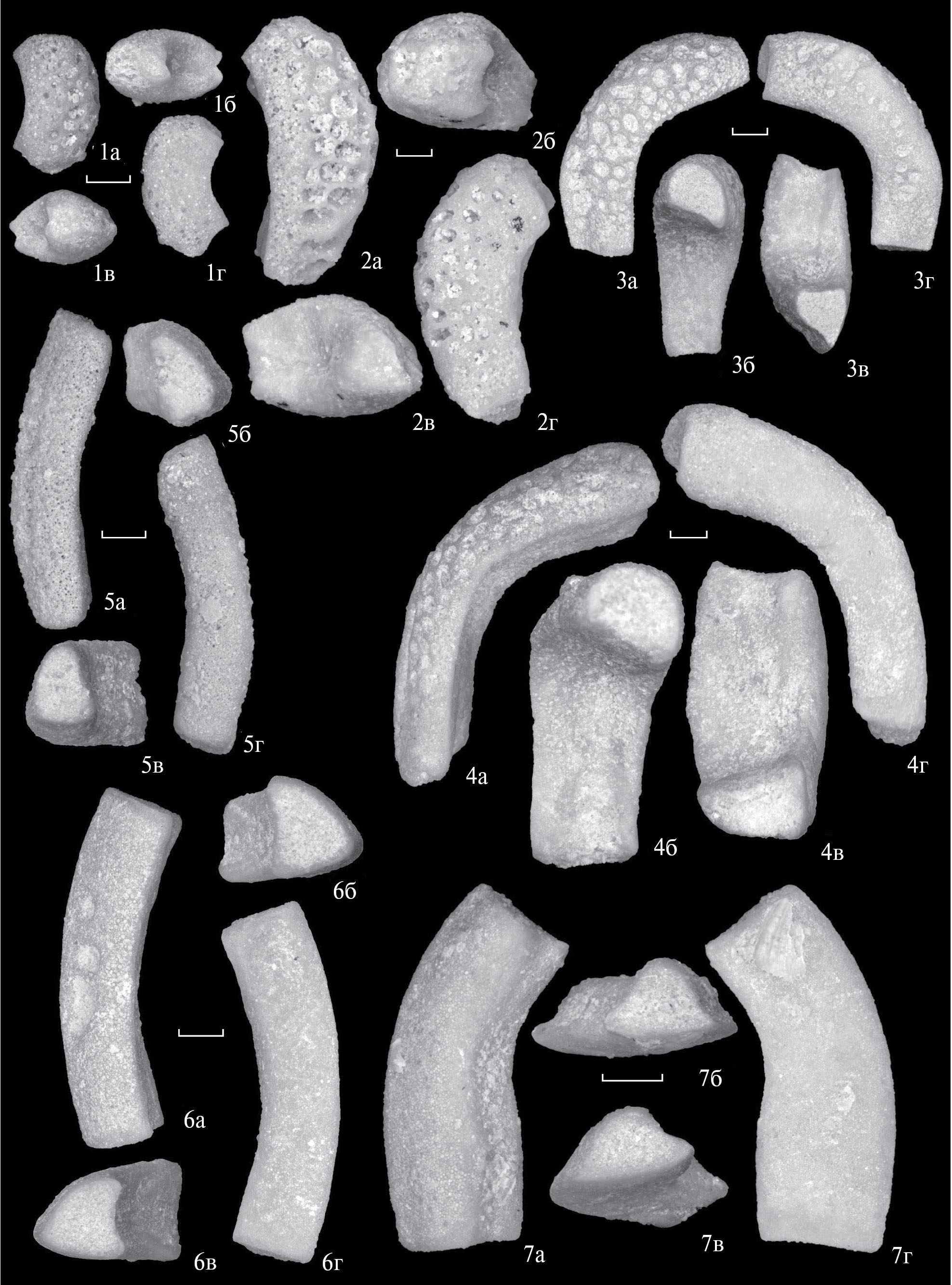 Фиг. 1–7. Phyllocystis cellularis sp. nov., отдельные маргинальные таблички: 1 – М2, экз. ПИН, № 4125/997: 1а – вид с дорсальной стороны, 1б – со стороны проксимальной фасетки, 1в – со стороны дистальной фасетки, 1г – с вентральной стороны; 2 – М2, экз. ПИН, № 4125/1023: 2а – вид с дорсальной стороны, 2б – со стороны проксимальной фасетки, 2в – со стороны дистальной фасетки, 2г – с вентральной стороны; 3 – М′2 , экз. ПИН, № 4125/1030: 3а – вид с дорсальной стороны, 3б – со стороны проксимальной фасетки, 3в – со стороны дистальной фасетки, 3г – с вентральной стороны; 4 – М′2 , экз. ПИН, № 4125/1031: 4а – вид с дорсальной стороны, 4б – со стороны проксимальной фасетки, 4в – со стороны дистальной фасетки, 4г – с вентральной стороны; 5 – табличка неопределенного положения, экз. ПИН, № 4125/989: 5а – вид с дорсальной стороны, 5б, 5в – вид со стороны фасеток, 5г – вид с вентральной стороны (дорсальная и вентральная стороны здесь и далее определяются по наличию скульптуры на первой и/или большей уплощенности второй, однако из-за неопределенности положения таблички относительно остального скелета ориентировка фасеток не указывается); 6 – табличка неопределенного положения, экз. ПИН, № 4125/1032: 6а – вид с дорсальной стороны, 6б, 6в – вид со стороны фасеток, 6г – вид с вентральной стороны; 7 – табличка неопределенного положения, экз. ПИН, № 4125/993: 7а – вид с дорсальной стороны, 7б, 7в – вид со стороны фасеток, 7г – вид с вентральной стороны; Ленинградская обл., Путиловский карьер; средний ордовик, дарривильский ярус, верхняя часть волховского горизонта (фризы). Длина масштабной линейки 1 мм.