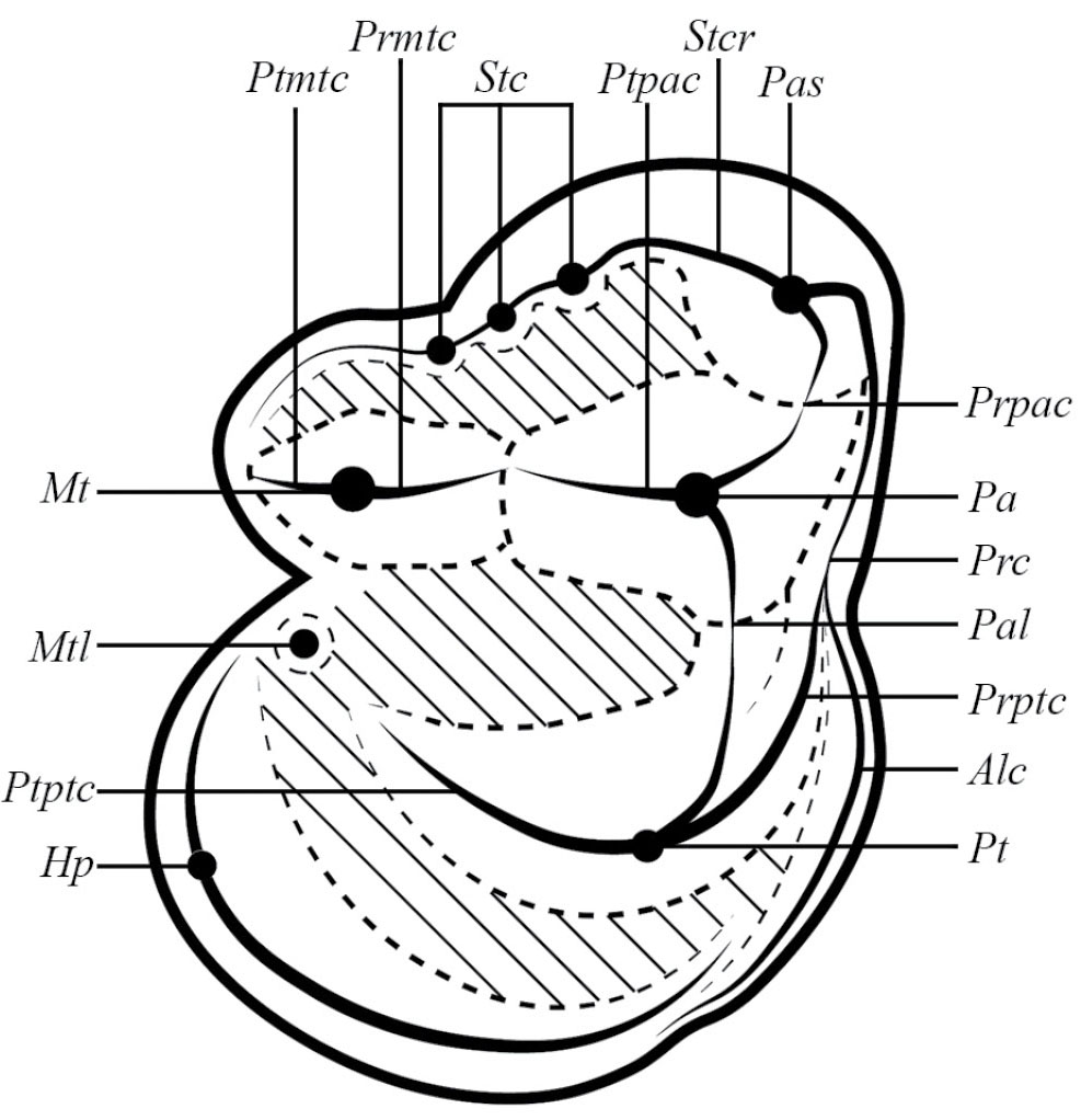 Рис. 1. Строение правого M1 Promephitis lartetii Gaudry, 1861, экз. ПИН, № 5126/767, вид с окклюзиальной стороны: Alc – антеролингвальный цингулюм; Hp – гипокон; Mt – метакон; Mtl – метаконуль; Prc – прецингулюм; Pa – паракон; Pal – паралоф; Pas – парастиль; Prpac – препаракриста; Prmc – преметакриста; Prptc – препротокриста; Pt – протокон; Ptmc – постметакриста; Ptpac – постпаракриста; Ptptc – постпротокриста; Stc – стилоконы; Stcr – стилокриста.