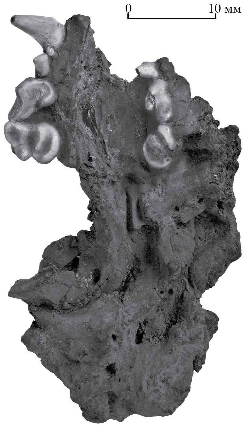 Рис. 2. Promephitis lartetii Gaudry, 1861, экз. ПИН, № 5126/767, деформированный череп с правым C1–M1 и левым P3–M1 с вентральной стороны; Россия, Тува, Таралык-Чер; верхний миоцен.