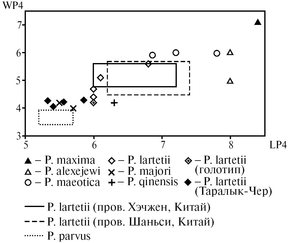 Рис. 6. Двухмерная диаграмма соотношения размеров P4 (W/L) Promephitis. Характер полей значений P. lartetii из Китая и P. parvus определяется интервалами промеров по: Wang, Qiu, 2004.