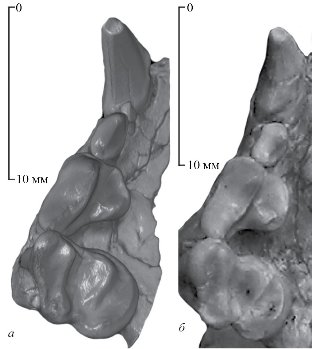 Верхний хищнический зуб (P4) относительно широкий (WP4/LP4 – 0.74–0.80; n = 4; табл. 2; рис. 6). P4 слегка длиннее M1 (LP4/LM1 – 1.03–1.13; n = 3). Главный бугорок P4 высокий. Его вершина слегка наклонена назад. Прецингулюм (спереди паракона) низкий. Длина метастиля составляет менее половины длины зуба. Хищническая вырезка отсутствует. Бугорок протокона сильно редуцирован. Его передний край расположен слегка мезиальнее переднего края паракона. На передней стороне коронки находится неглубокая выемка для плотно примыкающего заднего края Р3. Ширина выступа гипокона P4 составляет примерно половину ширины зуба. Бугорок гипокона невысокий: он почти вдвое ниже паракона P4. Гипокон слегка вытянут мезиодистально. Спереди от него расположен маленький добавочный бугорок. Между гипоконом и параконом находится небольшой бассейн, окклюдирующий с параконидом m1. Лабиальные стенки P4 и M1 в окклюзиальной плоскости образуют угол около 145° (n = 2).