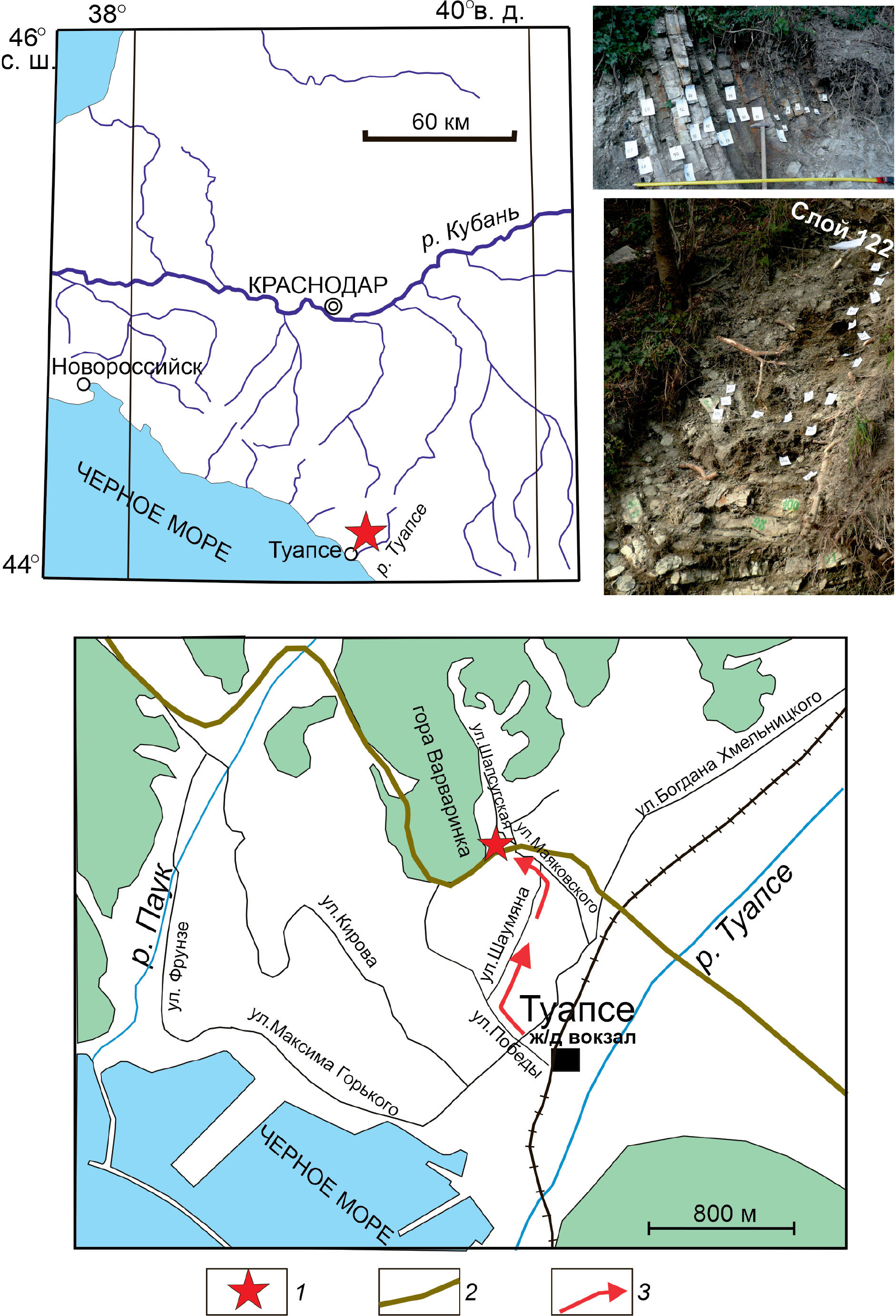 Рис. 1. местоположение разреза Шапсугский на схемах Краснодарского края, г. Туапсе и фрагменты разреза в обнажениях: 1 – место разреза, 2 – федеральная автомобильная дорога Новороссийск–Сочи, 3 – путь к разрезу от железнодорожного вокзала г. Туапсе.