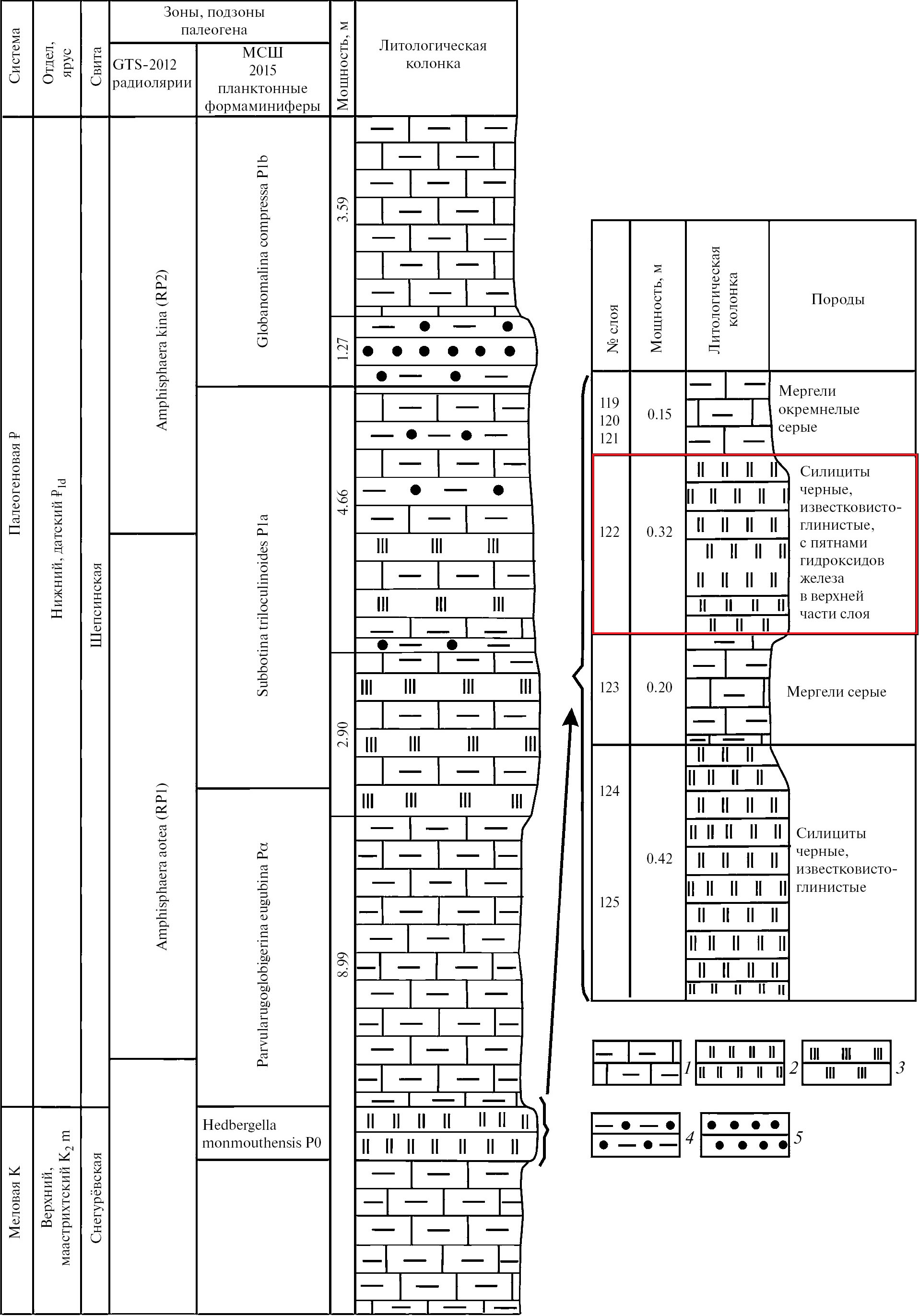Палеонтологическими исследованиями из силицитов средней части разреза выделены комплексы радиолярий, соответствующие видам-индексам Amhisphaera aotea Hollis и A. kina Hollis одноименных зон палеогена южных высоких широт глобальной шкалы палеогена GTS-2012, (RP1) и (RP2) (рис. 3, а–в). В карбонатных и терригенных разностях пород шепсинской свиты и пограничного горизонта обнаружены комплексы планктонных фораминифер подзон Р0-Р1b шкалы планктонных фораминифер палеоцена (Olsson et al., 1999) (рис. 3, г–е).