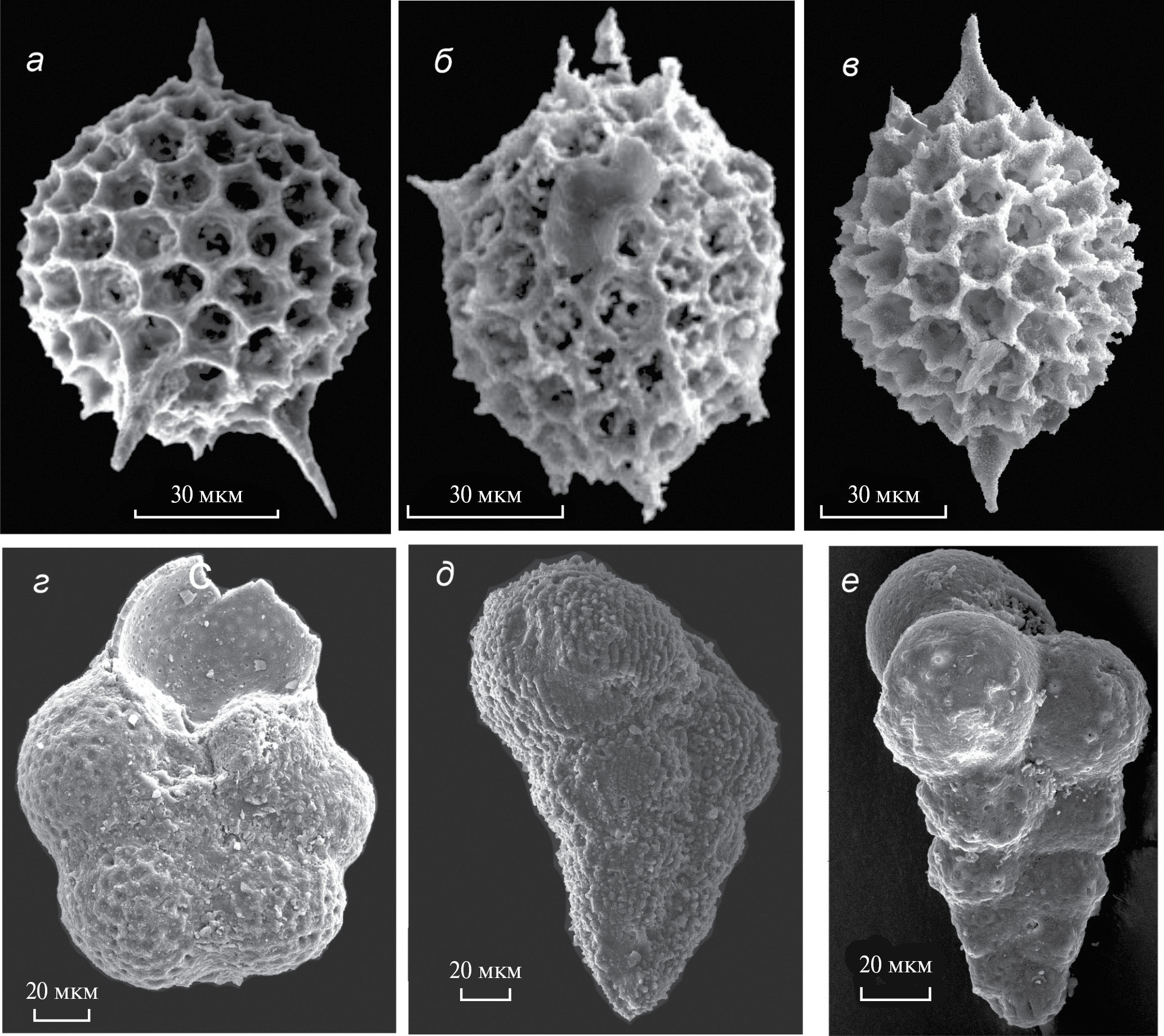 Рис. 3. Палеонтологические индикаторы пограничного мел–палеогенового слоя разреза Шапсугский, электронные изображения микрофауны: а – Amphisphaera aotea Hollis (экз. ЦГГА 2020, № 1/3), б – A. kina Hollis (экз. ЦГГА 2020, № 1/25), в – A. macrosphaera Nishimura (экз. ЦГГА 2020, № 1/101), г – Praemurica taurica (Morozova) (экз. ЦГГА 2020, № 2/1), д – Heterohelix globulosa (Ehrenberg) (экз. ЦГГА 2020, № 2/2), е – Guembelitria dammula Voloshinova (экз. ЦГГА 2020, № 2/3).