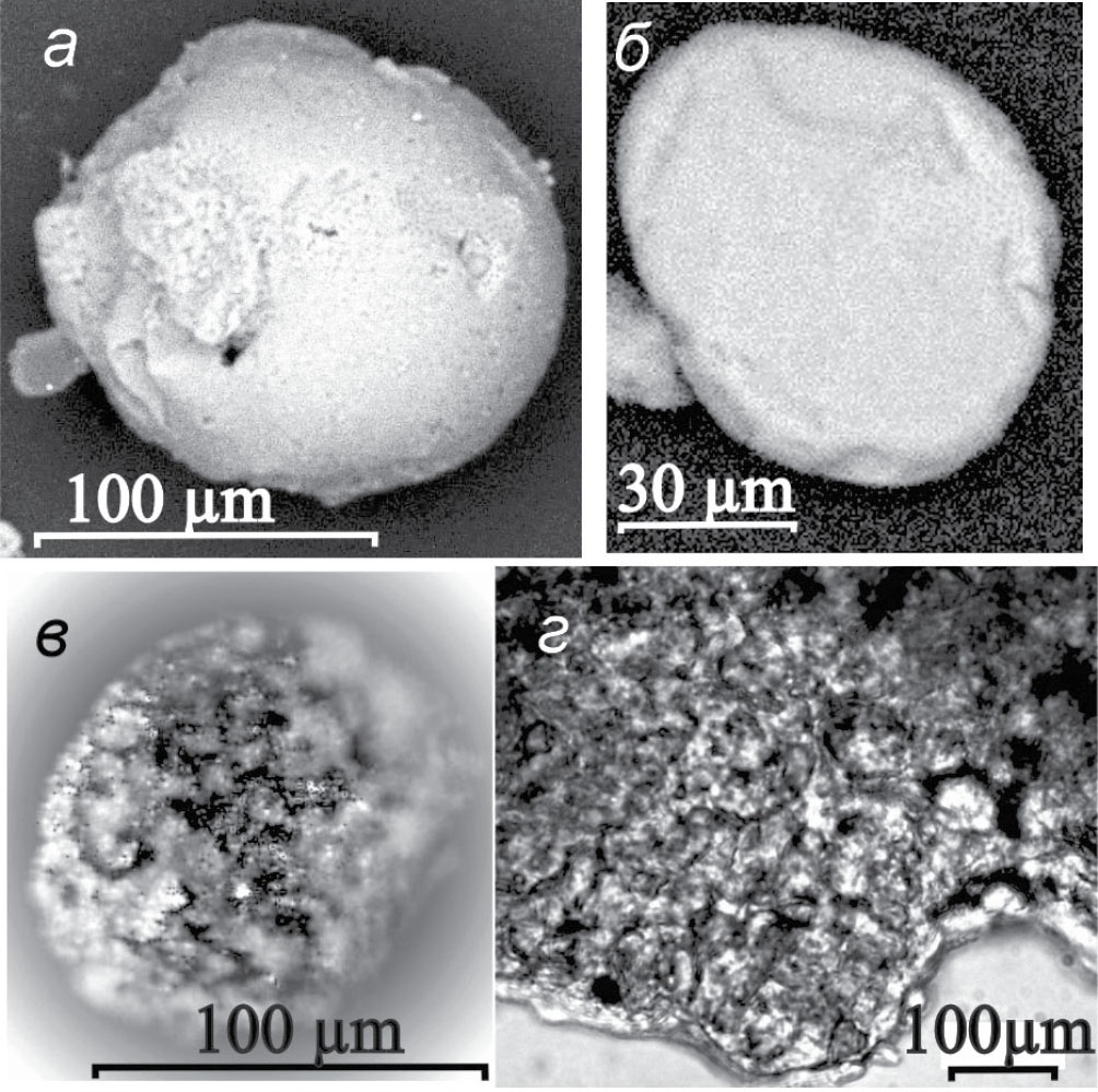 Рис. 4. микросферы: а, б – соответственно силикатного и алюмосиликатного состава (электронные изображения); в – магнетитового состава (фото на СЭМ); г – фрагмент обломка ожелезненного силикатного стекла с перлитовой структурой (фото в проходящем свете поляризационного микроскопа).