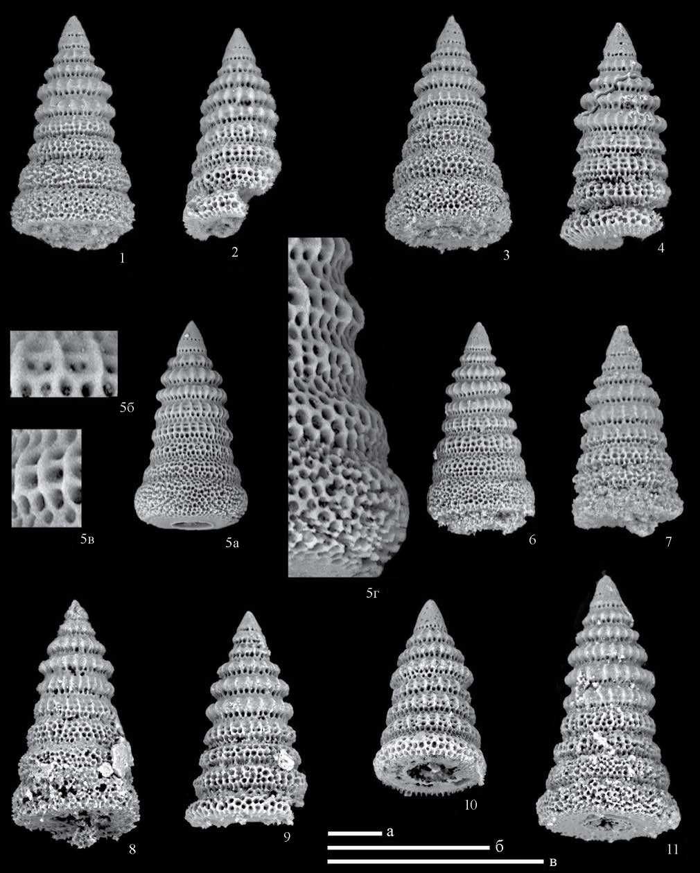 Фиг. 1–11. Pseudodictyomitra crassa Bragina, 2013: 1 – экз. ГИН, № 4878/251; 2 – экз. ГИН, № 4878/252; 3 – экз. ГИН, № 4878/253; 4 – экз. ГИН, № 4878/254; 5 – голотип ГИН, № 4878/78 (Брагина, 2013, табл. I, фиг. 2а, 2б): 5а – хорошо видна широкая септа с узкой апертурой; 5б – фрагмент, демонстрирующий развитие двух рядов пор между соседними ребрами: один из них имеет единственную пору, а другой – две поры; 5в – фрагмент, показывающий развитие единственного вертикального ряда из двух пор между соседними ребрами; 5г – фрагмент, демонстрирующий постепенную редукцию двойного ряда главных пор на межкамерных пережимах по направлению к финальной камере; 6 – экз. ГИН, № 4878/105 (Брагина, 2013, табл. I, фиг. 1а, 1б); 7 – экз. ГИН, № 4878/255; 8 – экз. ГИН, № 4878/256; 9 – экз. ГИН, № 4878/257; 10 – экз. ГИН, № 4878/258; 11 – экз. ГИН, № 4878/259; Кипр, формация Перапеди; разрез Мангалени-6, обр. 21-16-1, зона Alievium praegallowayi, нижний коньяк (фиг. 1); композитный разрез Мангалени (фиг. 2, 3, 5–7): 2 – обр. 21-14-1, зона Cyprodictyomitra longa, верхний коньяк; 3, 6, 7 – зона Alievium praegallowayi, нижний коньяк: 3 – обр. 21-16-1, 6 – обр. 03-3-0, 7 – обр. 21-16-3; 5 – обр. 03-3-5, зона Theocampe urna, нижний сантон; разрез Акамас, обр. 19-18-1, зона Alievium praegallowayi, нижний коньяк (фиг. 4); разрез Мангалени-8, зона Alievium praegallowayi, нижний коньяк (фиг. 8–10): 8 – обр. 21-18-5, 9 – обр. 21-18-2, 10 – обр. 21-18-5; разрез Мангалени-4, обр. 21-13-1, зона Alievium praegallowayi, нижний коньяк (фиг. 11). Длина масштабной линейки 100 мкм: а – для фиг. 1, 2, 3, 4, 5а, 6–9; б – для фиг. 5г; в – для фиг. 5б, 5в.