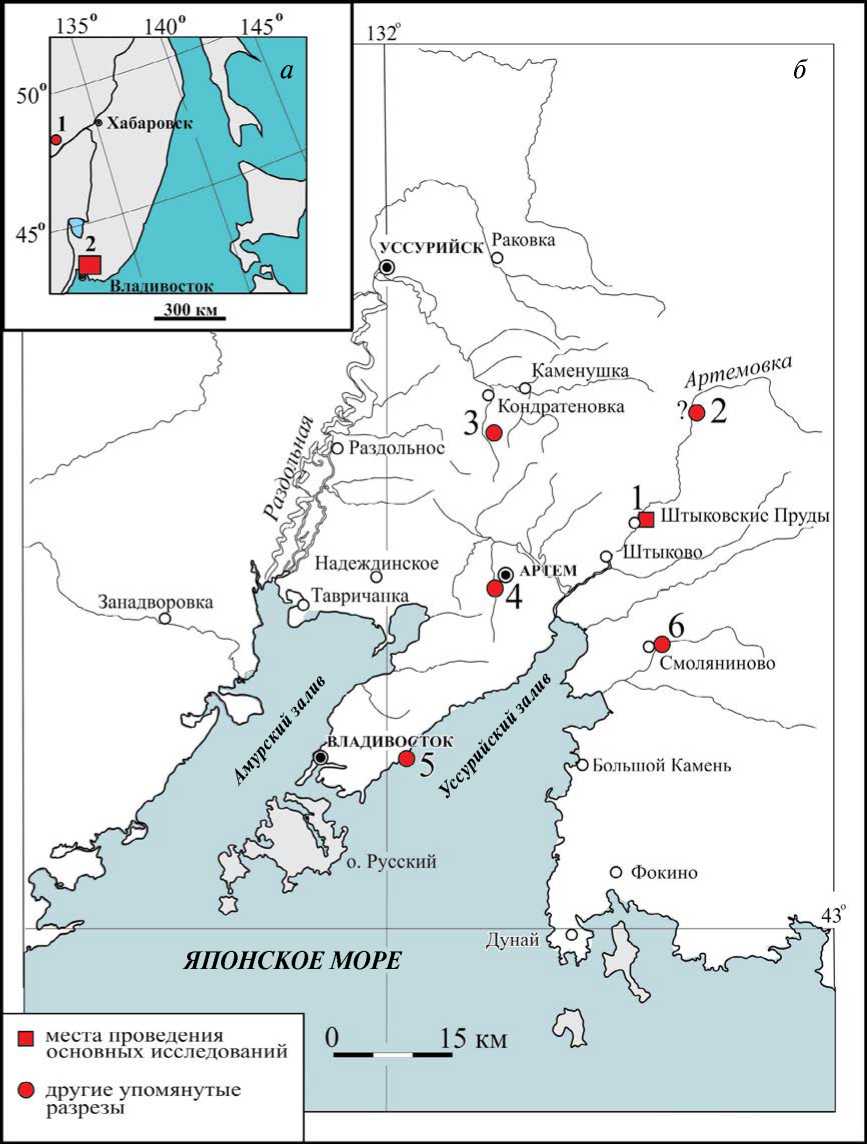 Карьер Штыковские Пруды расположен в бассейне р. Артемовка (Шкотовский р-н, Южное Приморье), в 4 км северо-восточнее одноименного парка отдыха (координаты карьера: 43°25′37.9′′ с.ш., 132°26′30.1′′ в.д.). Разрез представлен следующими подразделениями нижнетриасовой житковской свиты (рис. 3):