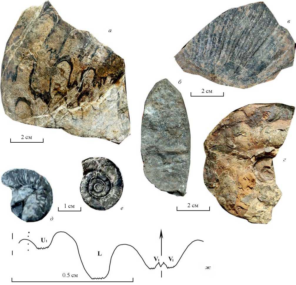 Рис. 4. Некоторые аммоноидеи из верхнесмитский зоны Shimanskyites shimanskyi разреза Штыковские Пруды Южного Приморья: а–в – фрагменты раковин Churkites cf. syaskoi: a – экз. ДВГИ, № 101/853, сбоку; б – экз. ДВГИ, № 102/853, форма поперечного сечения раковины; в – экз. ДВГИ, № 103/853, скульптура боковой стороны раковины; г – Prionites markevichi, экз. ДВГИ, № 104/853, сбоку; д – Shimanskyites shimanskyi, экз. ДВГИ, № 105/853, сбоку; е, ж – Glyptophiceras cf. sinuatum, экз. ДВГИ, № 108/853: е –сбоку; ж – лопастная линия при В = 4 мм.