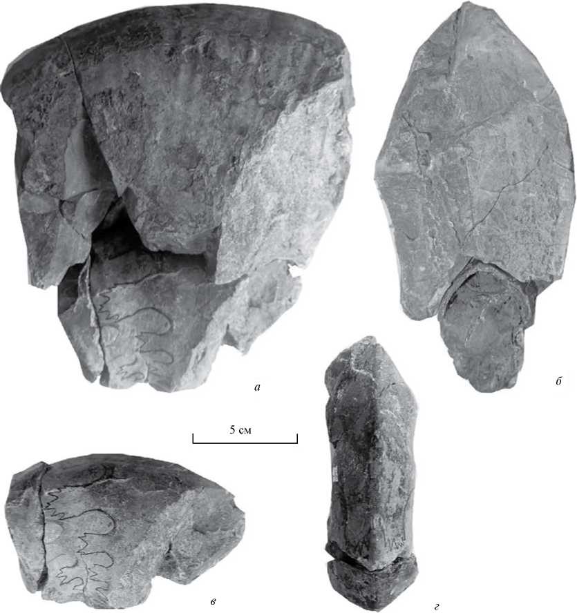 Рис. 7. Churkites egregius Zharnikova et Okuneva, голотип ЦНИГР музей, № 1/10379: а –сбоку (сочлененные фрагменты жилой камеры и фрагмокона), б – поперечное сечение оборотов раковины, в – сбоку (фрагмент фрагмокона); г – с вентральной стороны (фрагмент фрагмокона); бассейн р. Артемовка; оленекский ярус.