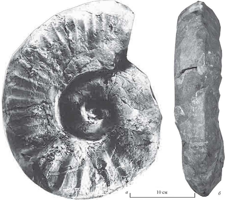 Рис. 8. Churkites ungunensis sp. nov., голотип ЦНИГР музей, № 1/12605: а – сбоку, б – с вентральной стороны; Хабаровский край, хр. Большие Чурки, юго-западные отроги, карьер, расположенный в 5.5 км к юго-западу от пос. Унгун; нижний триас, оленекский ярус, смитский подъярус, верхнесмитская конодонтовая зона Scythogondolella milleri, пачка тонкого переслаивания светло-серых песчаников и зеленоватых алевролитов.