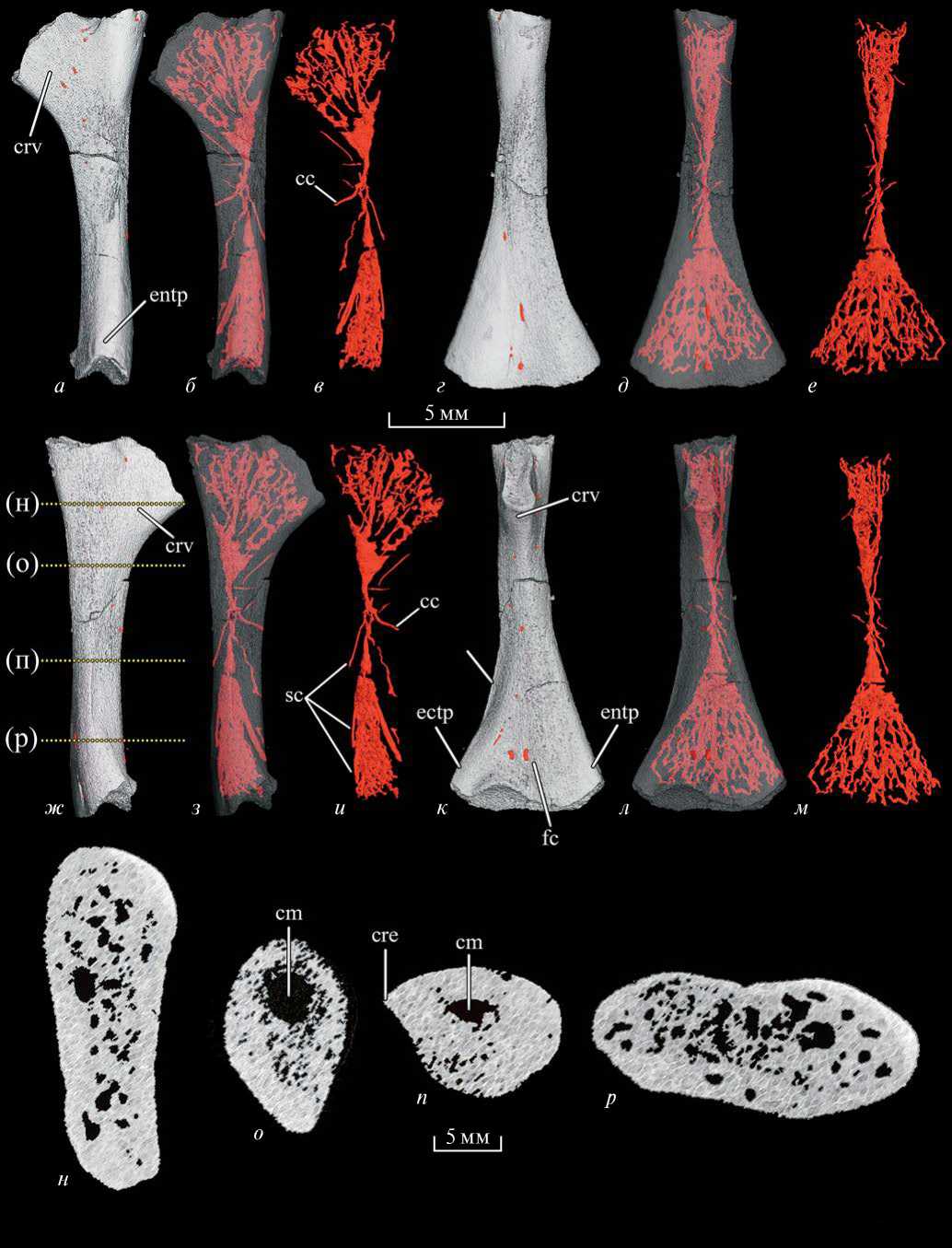 Внутреннее строение плечевой кости (экз. ZIN PH 38/246) характеризуется наличием сложной системы разветвленных васкулярных каналов и полостей, связанных с медуллярной полостью (рис. 1, о, п). Медуллярная полость в центральной области диафиза небольшая, но заметно расширяется в дистальном и проксимальном направлении, постепенно переходя в разветвленную сеть извилистых каналов, частично преобразованных в полости эрозии. С поверхностью кости эта сеть сообщается через несколько косых каналов, выходящих на вентральную и дорсальную стороны в дистальной части, и на латеральную и медиальную стороны в проксимальной. На каждой из сторон кости данные каналы идут почти параллельно друг другу по направлению в сторону эпифиза, под острым углом относительно длины кости (рис. 1, sc). В центральной части диафиза, на вентральной стороне, на поверхность кости выходит еще один крупный канал, расположенный более вертикально (рис. 1, cc). Вероятнее всего, данный канал является местом вхождения сосуда, питающего кость, в то время как косые каналы, выходящие на поверхность в области эпифизов, являются его терминальными участками, питающими надкостницу, связки и прилегающие к плечевой кости мышцы.