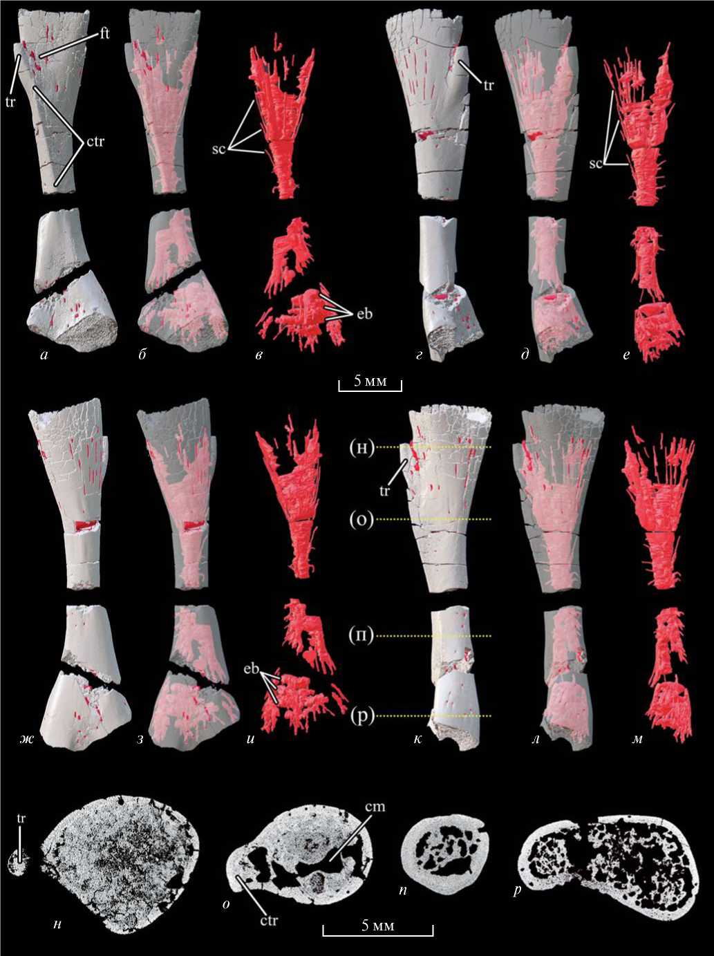 Рис. 3. Kulgeriherpeton ultimum Skutstchas et al., 2018, 3D-реконструкция правой бедренной кости (экз. ZIN PH 39/246) и реконструкция каналов ее кровеносной системы: а – реконструкция бедренной кости, вид с вентральной стороны; б, в – реконструкция кровеносной системы, вид с вентральной стороны; г – реконструкция бедренной кости, вид спереди, д, е – реконструкция кровеносной системы, вид спереди; ж – реконструкция бедренной кости, вид с дорсальной стороны; з, и – реконструкция кровеносной системы, вид с дорсальной стороны; к – реконструкция бедренной кости, вид сзади с указанием мест виртуальных срезов; л, м – реконструкция кровеносной системы, вид сзади; н–р – внутреннее строение бедренной кости на виртуальных срезах. Обозначения: ctr – гребень трохантера, сm – медуллярная полость, eb – полости эрозии, ft – вентральная ямка, sc – косые каналы, выходящие на поверхность кости, tr – трохантер.