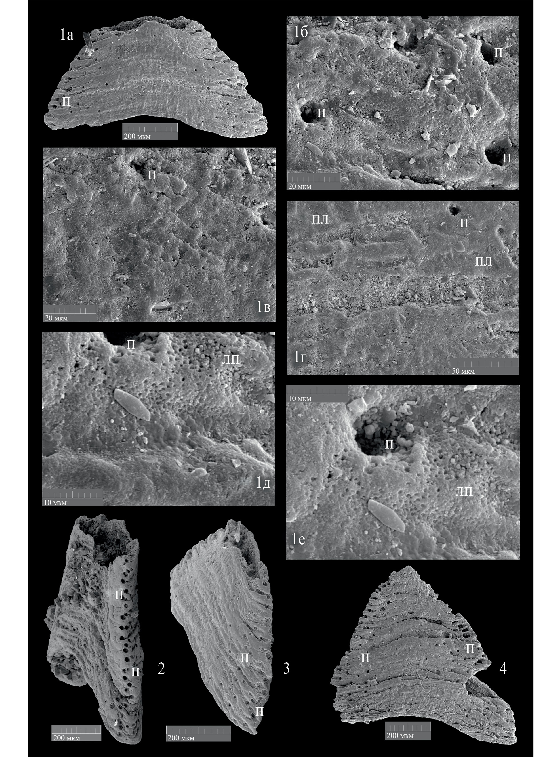 Фиг. 1–4. Tannuolina pavlovi Kouchinsky, Bengtson et Murdock, 2010: 1 – экз. ПИН, № 5083/5274: 1а – общий вид обломанного уплощенного склерита с частичными фрагментами наружного складчатого пористого слоя и внутреннего слоя; 1б–1е – увеличенные фрагменты наружной поверхности склерита с крупными порами и мелкопоровым рисунком; 2–4 – уплощенные склериты (sellate): 2 – экз. ПИН, № 5083/5240, передне-боковой вид; 3 – экз. ПИН, № 5083/5274, задне-боковой вид; 4 – экз. ПИН, № 5083/5272, общий вид склерита с фрагментами наружного слоя; Сибирская платформа, разрез по прав. берегу р. Сухая Тунгуска, ниже устья руч. Бечевник; томмотский ярус, костинская свита. Обозначения: лп – ложные поры, п – поры, пл – пленка.