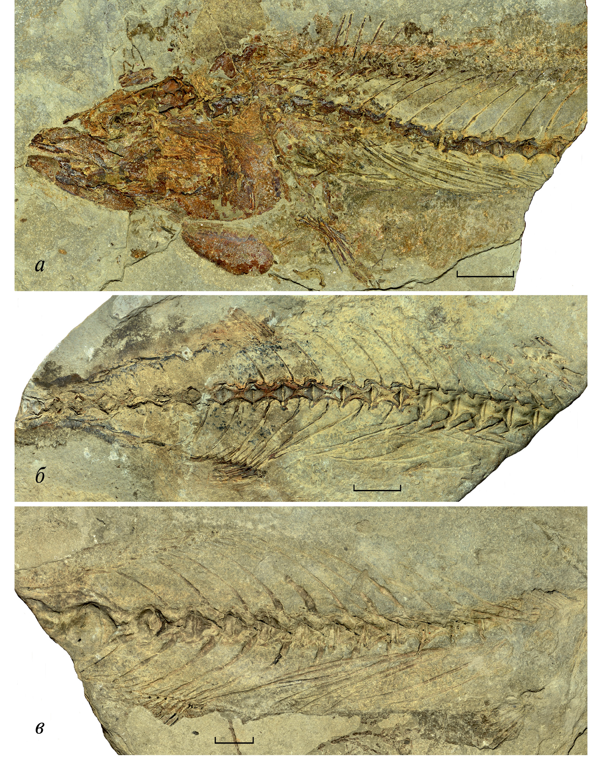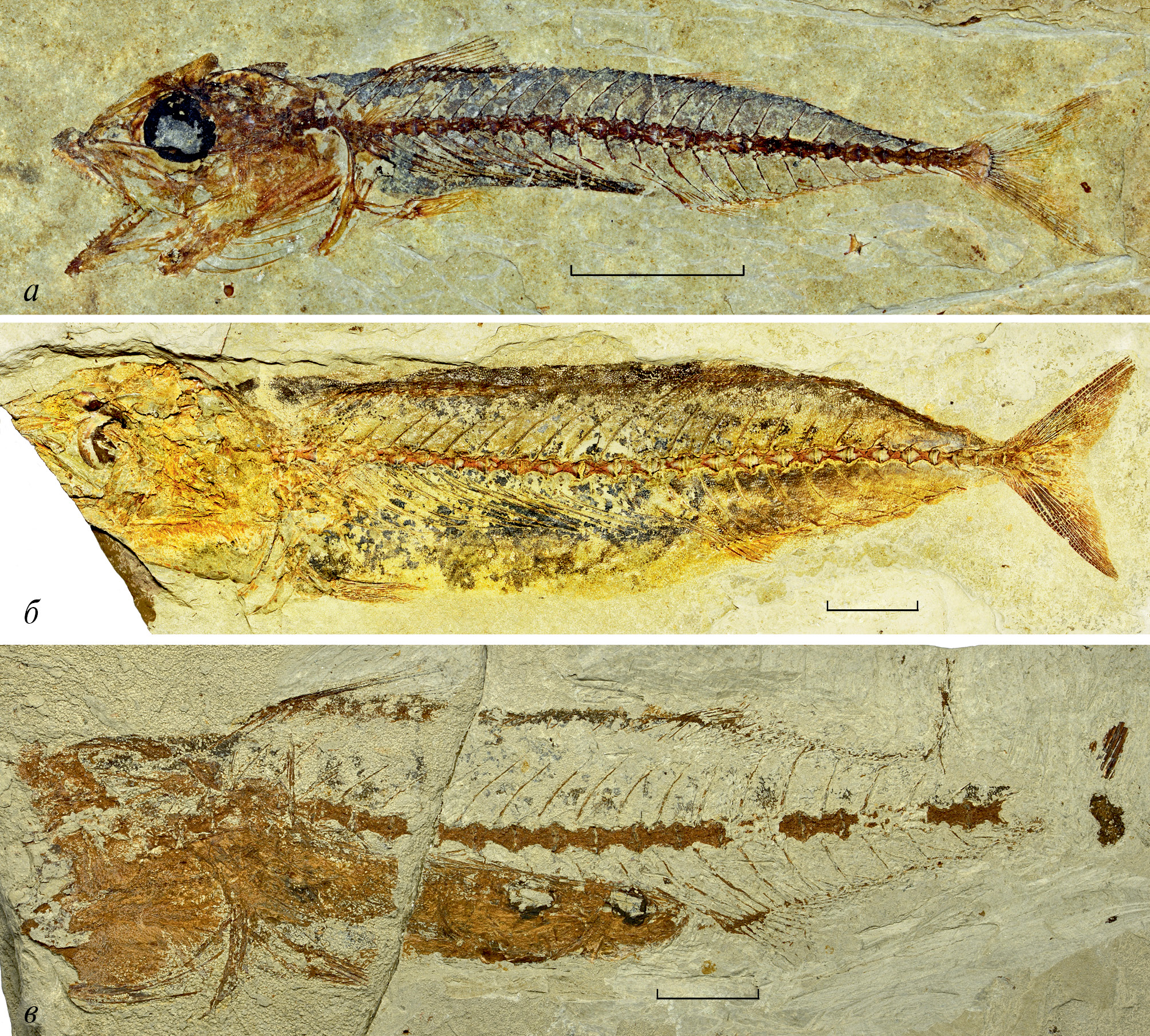 Рис. 1. Mioscomber caucasicus (Bogatshov, 1933): а – экз. ПИН, № 5073/143, полный скелет, покрыт глицерином для лучшего контраста; б – экз. ПИН, № 5073/144, почти полный скелет; в – экз. ПИН, № 5073/145, неполный скелет; Краснодарский край, Апшеронский р-н, р. Пшеха ниже хут. Цуревский; верхи среднего миоцена, нижний сармат. Масштабная линейка – 1 см (фиг. а, в), 2 см (фиг. б).