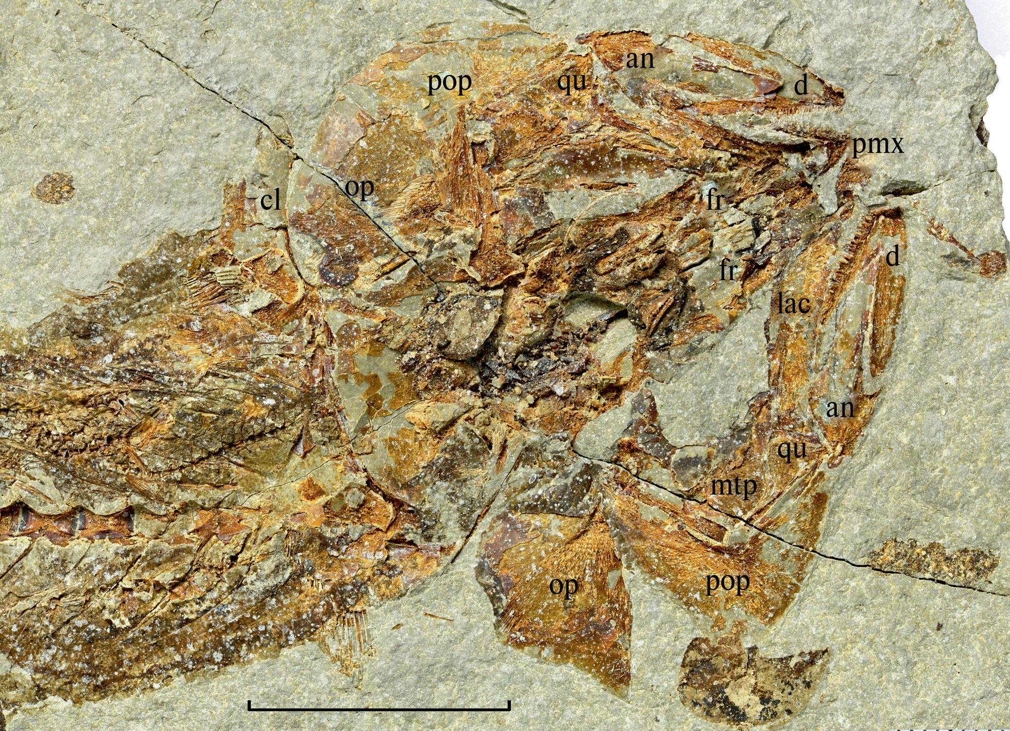 Рис. 3. Mioscomber caucasicus (Bogatshov, 1933), экз. ПИН, № 5073/149, передняя часть скелета; Краснодарский край, Апшеронский р-н, р. Пшеха в 1 км ниже хут. Цуревский; верхи среднего миоцена, нижний сармат. Обозначения: an – angulo-articulare, cl – cleithrum, d – dentale, fr – frontale, lac – lacrimale, mtp – metapterygoideum, op – operculum, pmx – praemaxillare, pop – praeoperculum; qu – quadratum. Масштабная линейка – 2 см.