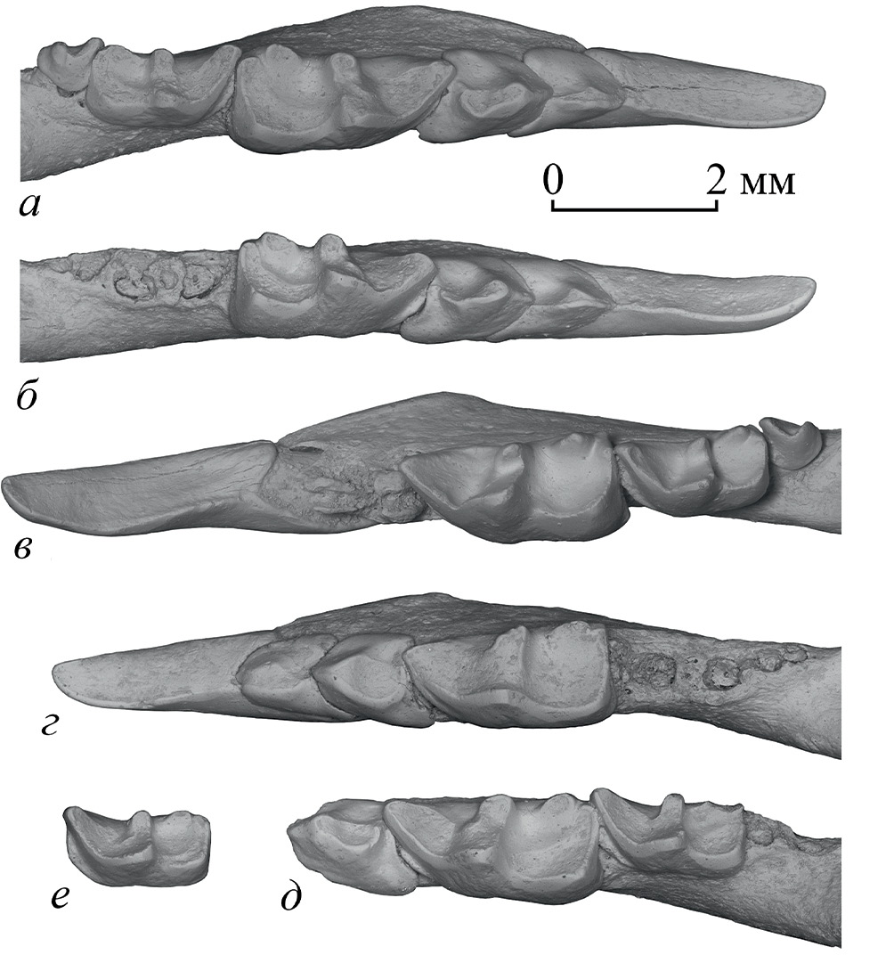 Рис. 4. Anourosorex andabata sp. nov., нижние зубы с окклюзиальной стороны (СЭМ): а – экз. ПИН, № 5826/827, правые I1–M3; б – экз. ПИН, № 5826/829, правые I1–M1; в – голотип ПИН, № 5826/828, левые I1 и M1–M3; г – экз. ПИН, № 5826/830, левые I1–M1; д – экз. ПИН, № 5826/831, левые P4–M2; е – экз. ПИН, № 5826/624, левый M2; Вьетнам, провинция Лангшон, пещера Там-Хай; средний плейстоцен.