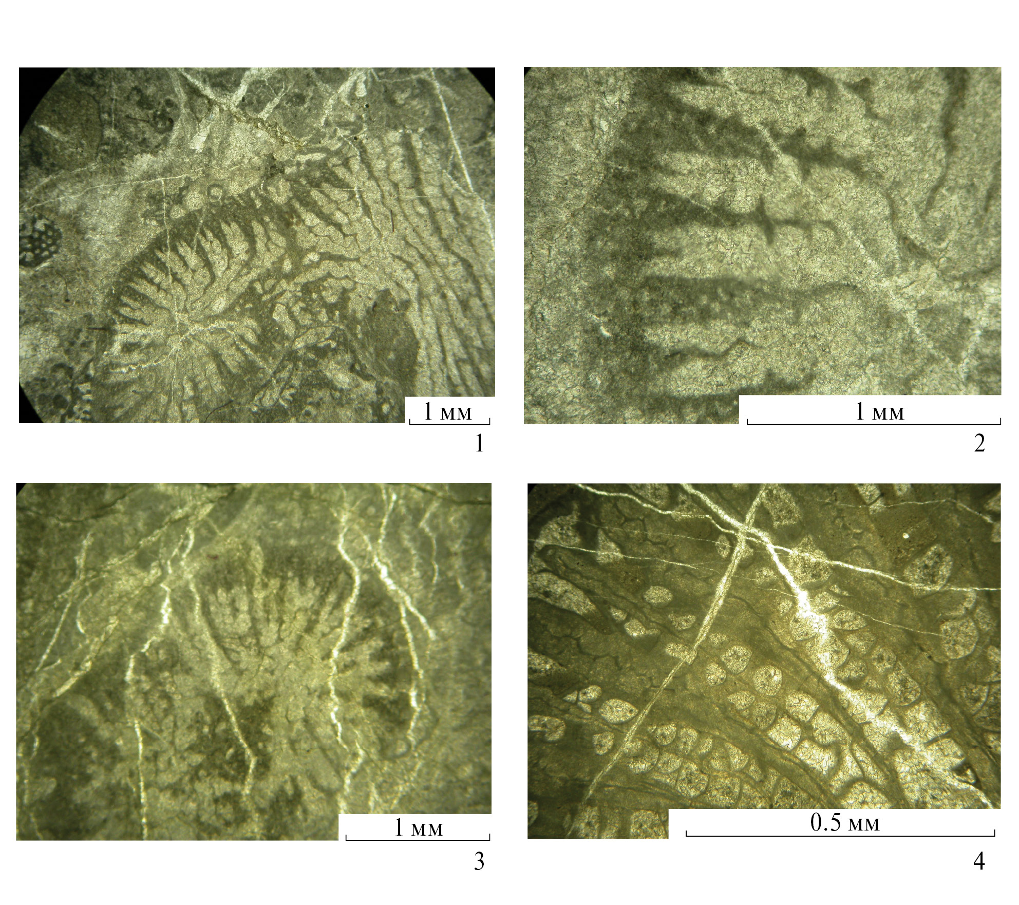 Фиг. 1–4. Кuhnastraea rara sp. nov.: 1–3 – голотип ДВГИ ДВО РАН, № 43/560: 1 – продольное и поперечное сечение колонии; 2 – фрагмент поперечного сечения кораллита: в центре септо-косты с волнистой срединно-септальной плоскостью; 3 – поперечное сечение кораллита, внутричашечное почкование; 4 – экз. № 43/562, поперечное сечение кораллита, септо-косты первого и второго порядка; Сихотэ-Алинь, Дальнегорский р-н, г. Сахарная; верхний триас, средненорийский подъярус; сборы Т.А. Пуниной.