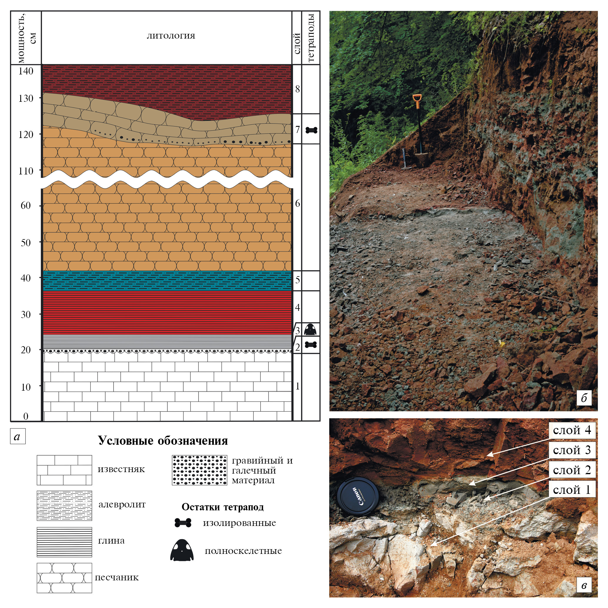 Из остатков тетрапод, обнаруженных в местонахождении, наибольший интерес представляют находки, происходящие из раскопочных площадок, заложенных в правом борту, и приуроченные к перекрывающим костеносный гравелит серым известковистым глинам, мощность которых составляет 3–8 см (рис. 1: слой 3). В отличие от гравелитов, слой характеризуется значительно меньшей концентрацией костных остатков, но при этом содержит материал скелетной сохранности, принадлежащий ювенильным амфибиям различной таксономической принадлежности, преимущественно – сеймуриаморфам (Буланов, 2010).