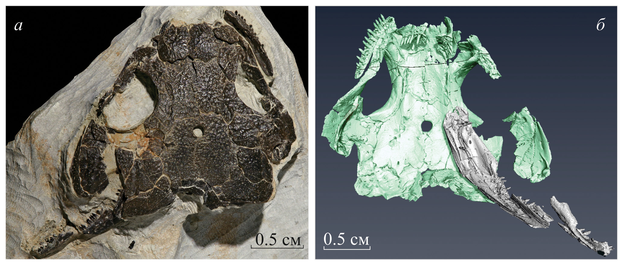Рис. 2. Volgerpeton exspectatus gen. et sp. nov., голотип ПИН, № 5303/131, череп ларвальной особи: а – вид сверху; б – КТ-реконструкция, демонстрирующая части черепа, скрытые внутри породы, вид с вентральной стороны; Республика Татарстан, Тетюшский р-н, местонахождение Монастырский Овраг-D; средняя пермь, терминальная часть уржумского яруса.