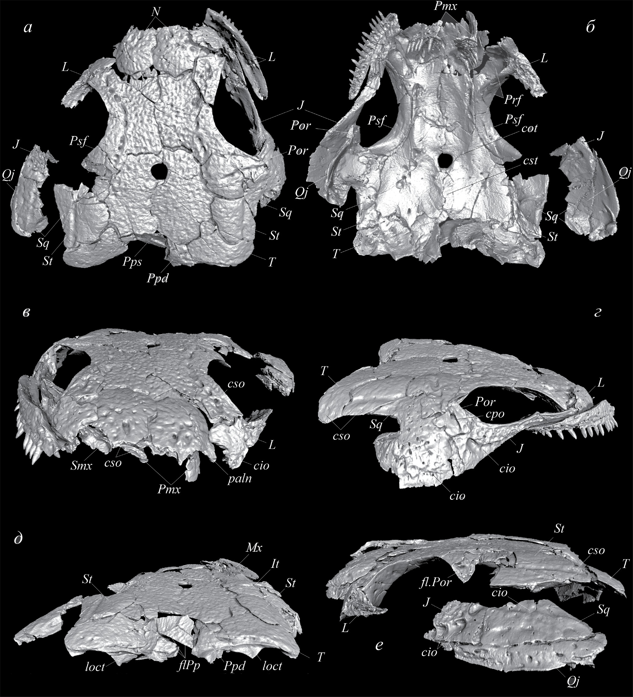 Рис. 3. Volgerpeton exspectatus gen. et sp. nov., голотип ПИН, № 5303/131, КТ-реконструкция черепа (нижняя челюсть не показана): а – дорсально, б – вентрально, в – антеродорсально, г – латеродорсально (справа), д – постеродорсально, е – латерально (слева). Обозначения: cio – инфраорбитальный канал сейсмосенсорной системы, cot – орбитотемпоральный гребень, cso – супраорбитальный канал сейсмосенсорной системы, cst – сагиттальный гребень, fl.Por – фланг причленения заглазничной кости, It – межвисочная кость, J – скуловая кость, L – слезная кость, loct – затылочная пластина таблитчатой кости, Mx – верхнечелюстная кость, N – носовая кость, paln – антеролатеральный отросток носовой кости, Pmx – предчелюстная кость, Por – заглазничная кость, Ppd – правая заднетеменная кость, Pps – левая заднетеменная кость, Prf – переднелобная кость, Psf – заднелобная кость, Qj – квадратноскуловая кость, Smx – септомаксиллярная кость, Sq – чешуйчатая кость, St – надвисочная кость, T – таблитчатая кость.