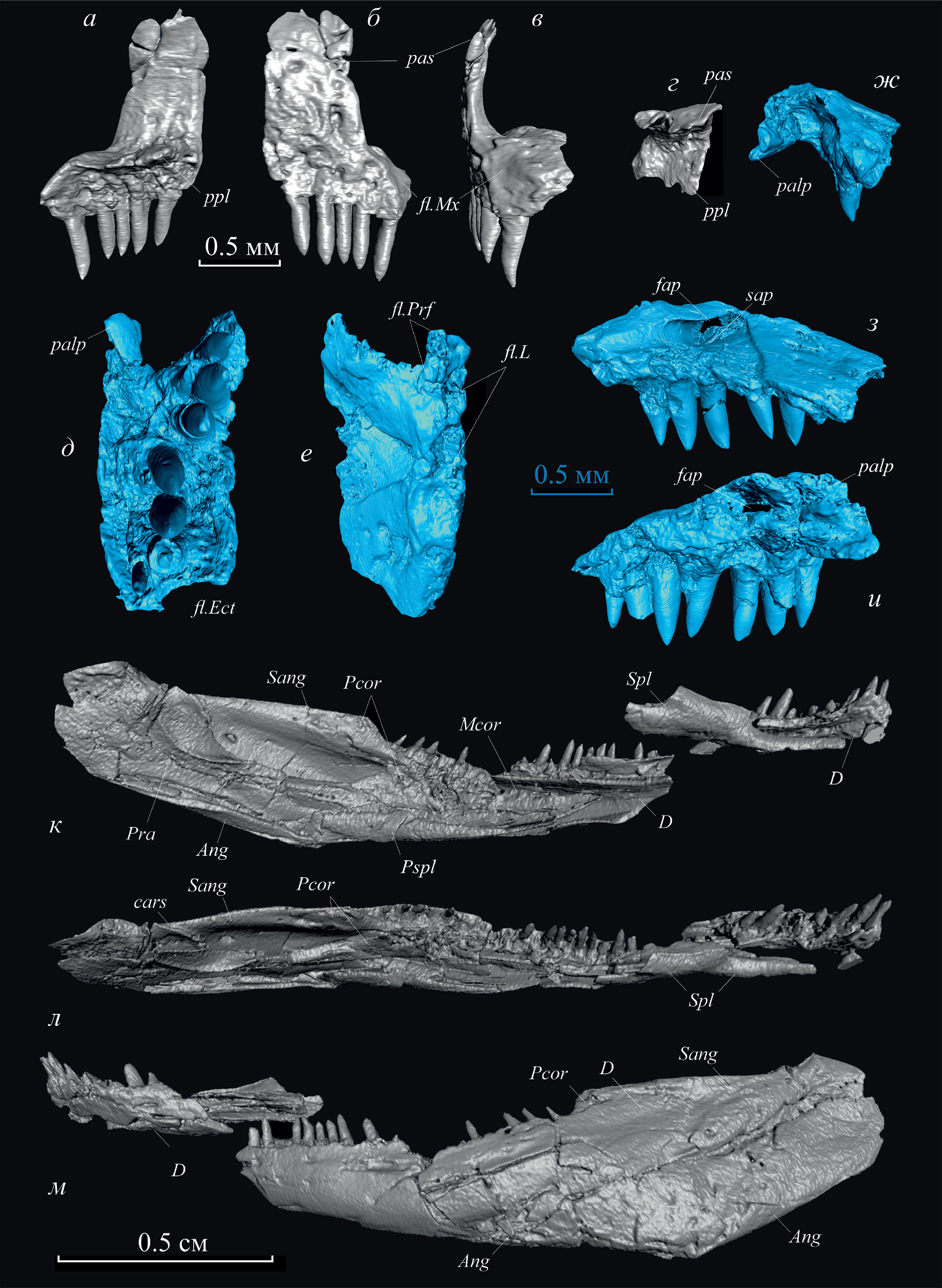Рис. 5. Volgerpeton exspectatus gen. et sp. nov., голотип ПИН, № 5303/131, KT-реконструкции: а–г – левое praemaxillare: а – сзади, б – спереди, в – латерально, г – дорсально; д–и – правый vomer: д – вентрально, е – дорсально, ж – спереди, з – медиально, и – латерально; к–м – левая ветвь нижней челюсти: к – медиально, л – дорсально, м – латерально. Обозначения: Ang – угловая кость; cars – гребень, ограничивающий спереди сочленовную кость; D – зубная кость; fap – отверстие постхоанного анастомоза; fl. (Ect, L, Mx, Prf) – фланги причленения наружнокрыловидной, слезной, верхнечелюстной и переднелобной костей, соответственно; Mcor – средний короноид; palp – антеролатеральный отросток небной кости; pas – восходящий (дорсальный) отросток предчелюстной кости; Pcor – задний короноид; ppl – небный отросток предчелюстной кости; Pra – предсочленовная кость; Pspl – задняя пластинчатая кость; Sang – надугловая кость; sap – желоб постхоанного анастомоза; Spl – пластинчатая кость.