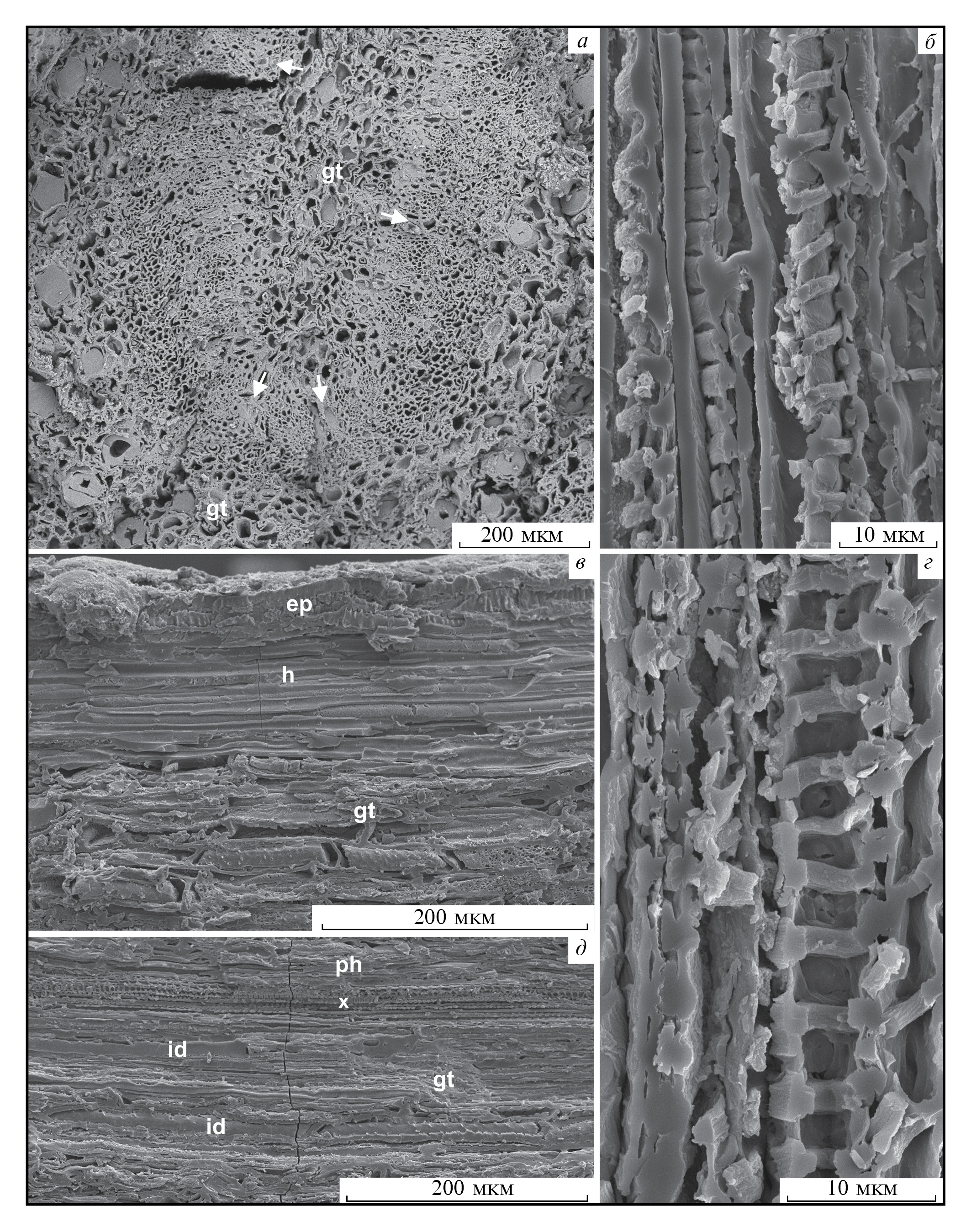 Рис. 4. Otozamites meyenii sp. nov., экз. ПИН, № 5173/87, СЭМ: а – фрагмент верхнего ряда проводящих пучков, стрелками показаны прорывы между проводящими пучками; б – трахеиды со спиральными утолщениями и лестничными окаймленными порами; в – фрагмент горизонтального скола рахиса, видны клетки эпидермиса с пористыми стенками, прозенхиматозные клетки гиподермы и клетки основной паренхимы; г – трахеида со стенкой, имеющей внутренние спиральные утолщения и крупные простые поры; д – фрагмент горизонтального скола рахиса, видны проводящий пучок и основная паренхима ковнутри от него, содержащая идиобласты. Обозначения как на рис. 1 и 2.