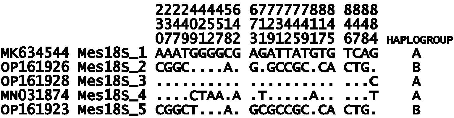 The Mes18s_1 haplotype included 7 nucleotide sequences (MK634544, MK634546, MK634547, OP161922, OP161924, OP161927, OP161977) and Mes18s_2 included two sequences (OP161921 and OP161926), however, to simplify the analysis we used only one of identical sequences (for Mes18s_1 – MK634544, for Mes18s_2 – OP161926).