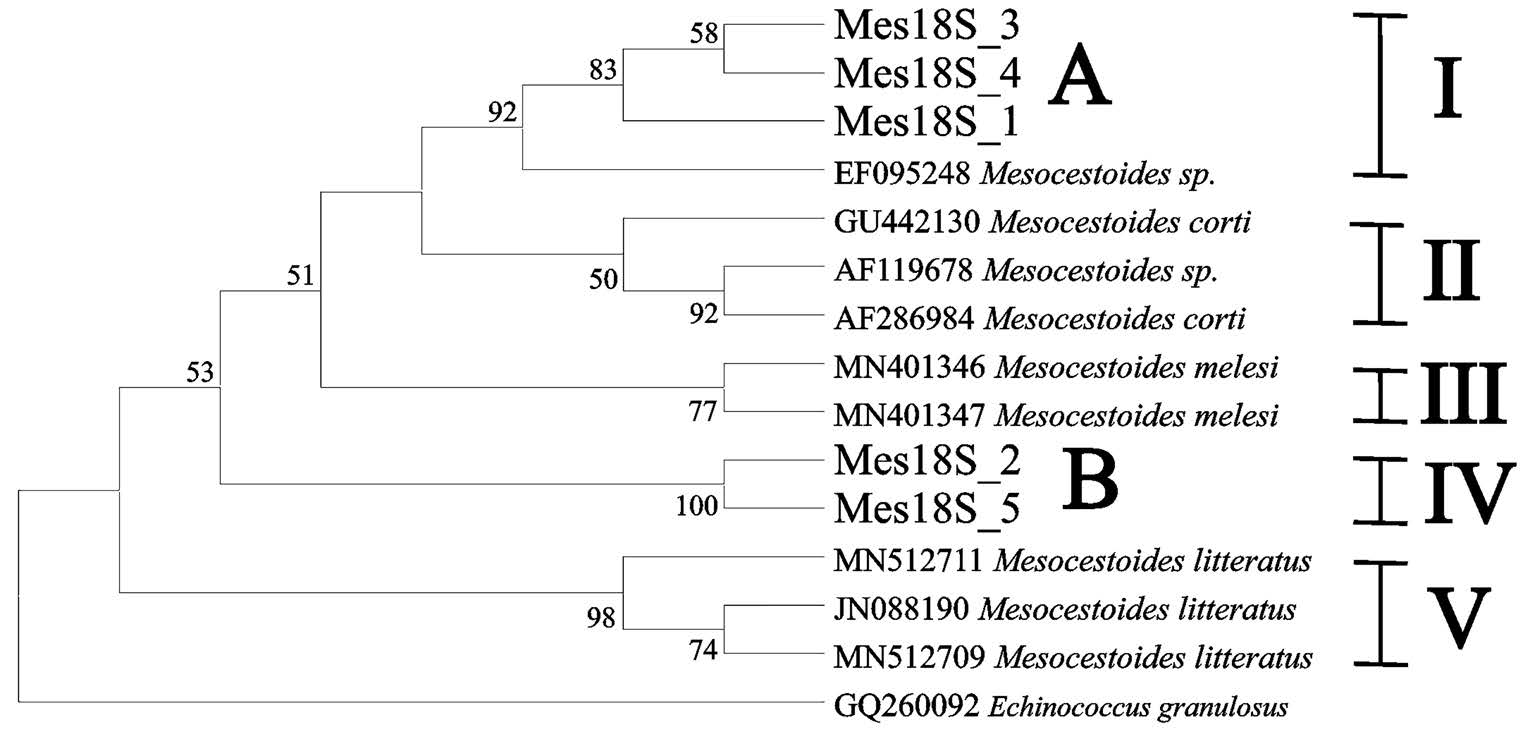 For phylogenetic analysis of the obtained nucleotide sequences of the 18S rRNA gene, information about the corresponding fragment of this gene from samples belonging to the genus Mesocestoides was taken from GenBank (Table 2).