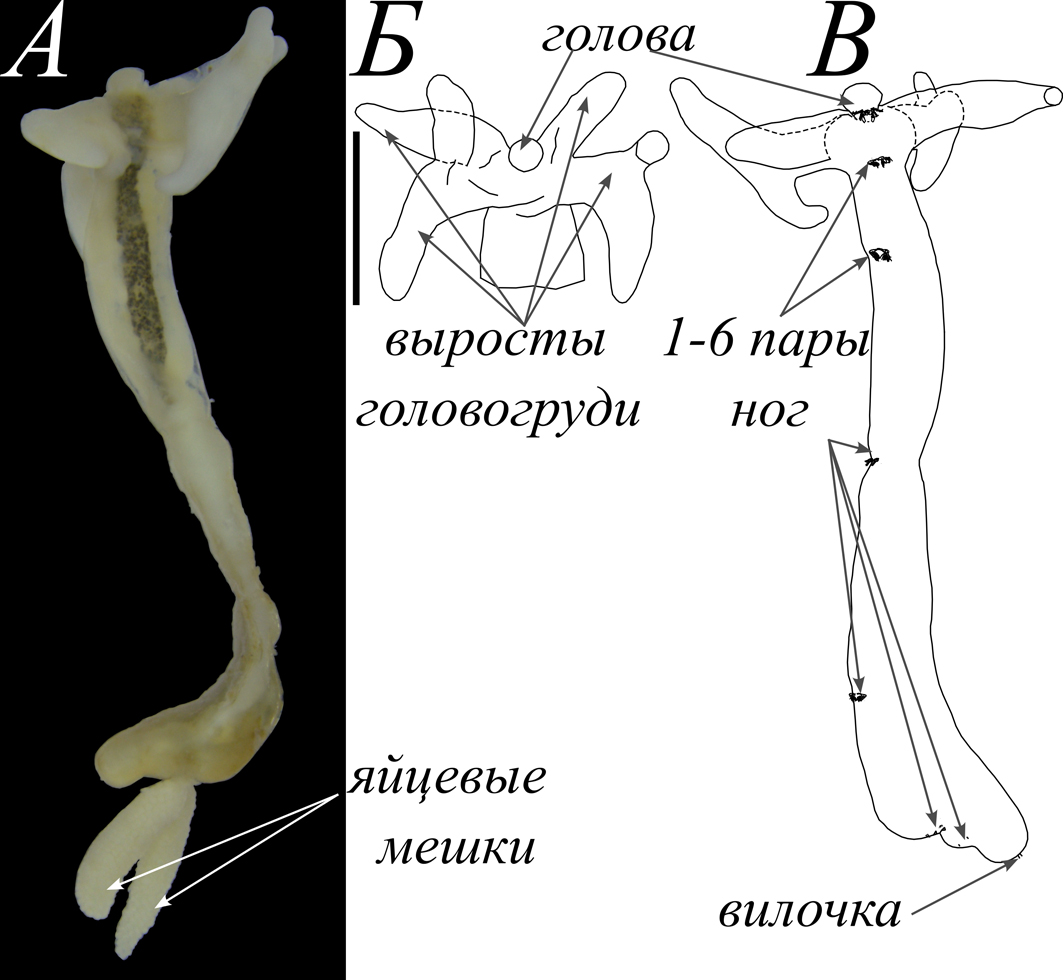 Ключевым морфологическим признаком L. cyprinacea является наличие хорошо развитых выростов головогруди, с помощью которых копепода фиксируется в теле хозяина (Бауер, 1987; Kabata, 1988) (рис. 2).