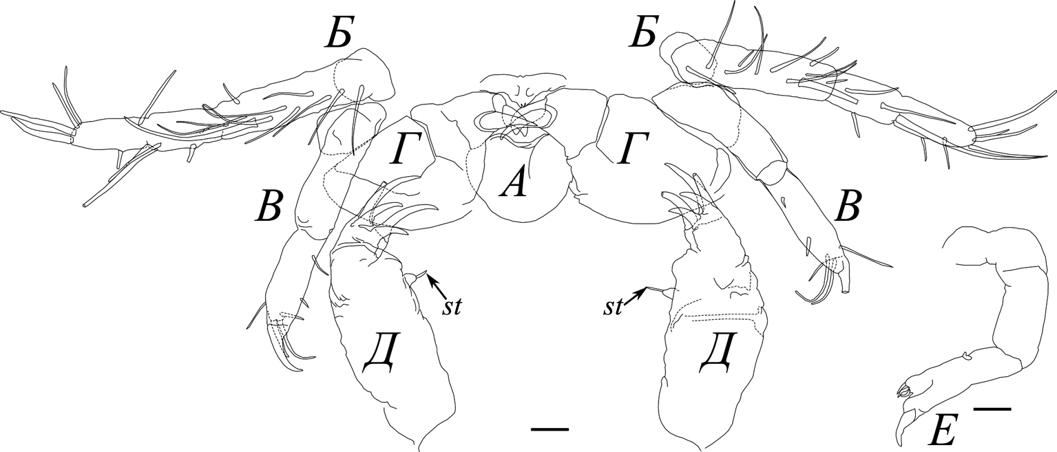 Антенны и антеннулы расположены на голове антеро-латерально (рис. 3). Антеннула (рис. 3В) длиной 200 мкм состоит из четырех подомеров, из которых второй, третий и четвертый несут по 11, 4 и 6 щетинок, соответственно. Антенна (рис. 3Б) длиной 130 мкм состоит из трех подомеров. Дистальный подомер антенны несет шесть щетинок и вооружен подвижным коготком (20 мкм). Треугольная верхняя и расположенная между максиллами II нижняя губы образуют буккальную полость (рис. 3А). Мандибулы размером 160 мкм состоят из трех подомеров (рис. 3Е). Дистальный подомер вооружен одним крючком (длиной 20 мкм) и тремя близко расположенными шипами (длиной 10 мкм каждый). Максиллы II (рис. 3Г) состоят из двух подомеров и оканчиваются сильным хитинизированным коготком с двумя выростами. Длина максилл II и когтя составляет 80 мкм и 26 мкм соответственно. Максиллипеды (длиной 110 мкм) состоят из двух подомеров (рис. 3Д). Вентральный подомер с внутренней стороны имеет одиночную щетинку длиной 10 мкм. Дистальный подомер несет на конце пять крючков длиной 17–50 мкм.