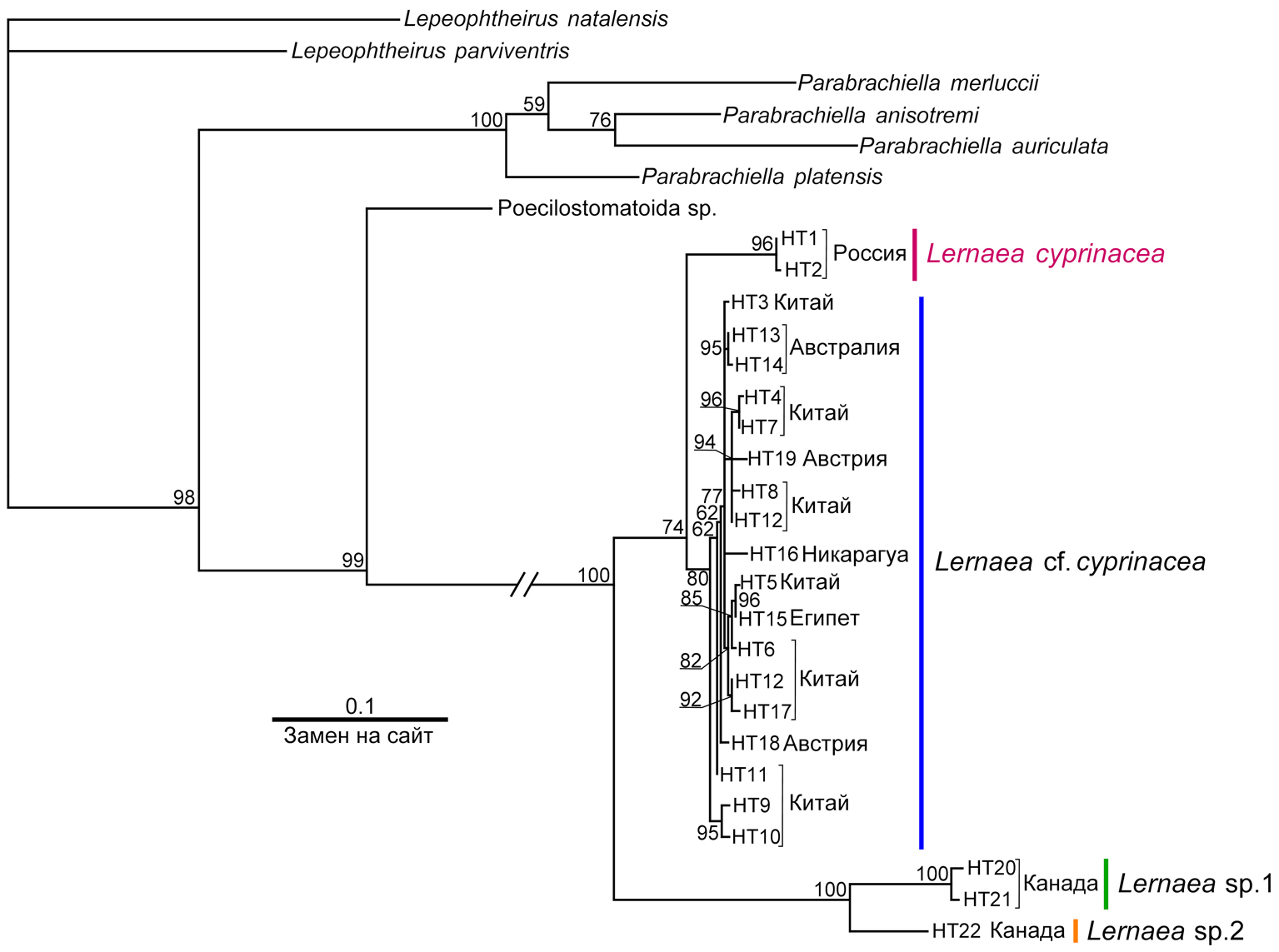 Исходя из полученного филогенетического дерева и рассчитанной матрицы генетических расстояний по гену COI, принимая за граничное значение для видов р-дистанции более 2% (Hebert et al., 2003), можно предположить наличие четырех видов: L. cyprinacea (Россия), L. cf. cyprinacea (Австралия, Австрия, Египет, Китай и Никарагуа) и Lernaea sp. 1 и Lernaea sp. 2 (Канада). Наибольшие межвидовые р-дистанции (18.0–18.3%) наблюдаются с двумя видами Lernaea sp. из Канады – 18.0% и 18.3%.