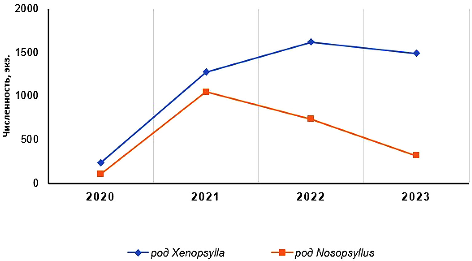 Figure 2. Dynamics of the number of fleas of the genera Xenopsylla and Nosopsyllus by years