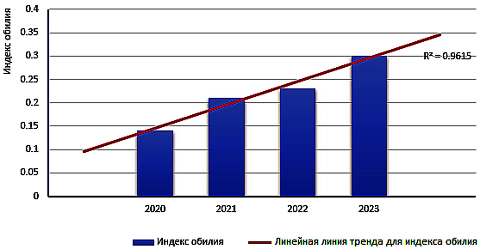 Как видно из рис. 3, индекс обилия блох в изучаемом природном мезоочаге с годами увеличивается. И как указывает величина достоверности аппроксимации линейной линии тренда (R2 = 0.9615), предполагается его дальнейшее увеличение.