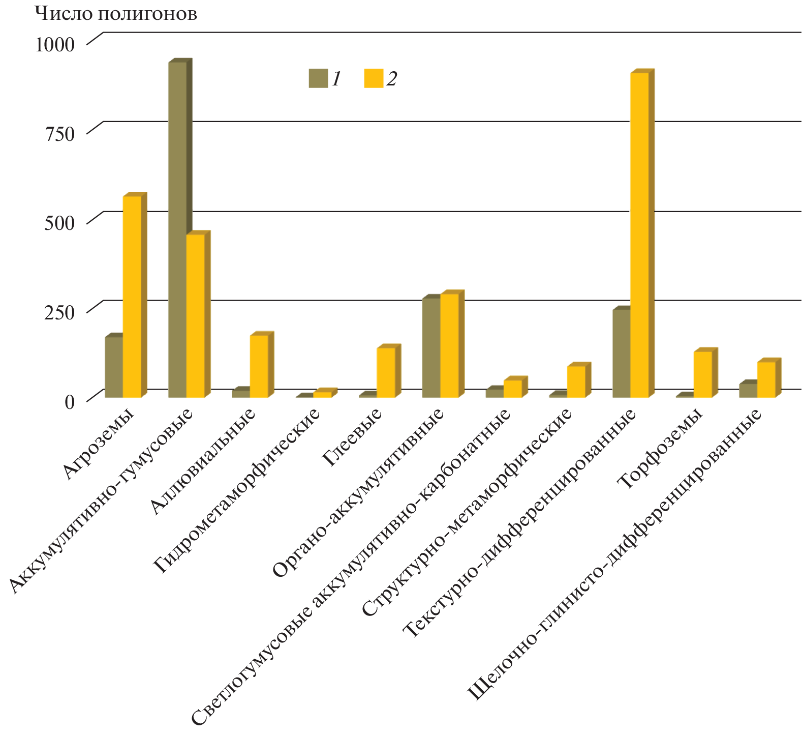 Измененные земледелием (агрогенные) почвы обычно не входят в содержание мелкомасштабных почвенных карт, в том числе Почвенной карты Российской Федерации масштаба 1 : 2.5 млн (1988). Одним из элементов ее обновления, проводимого в Почвенном институте им. В.В. Докучаева, является введение в содержание карты агрогенных почв и перевод в них части природных почв. Природные почвы были предварительно интерпретированы в формате классификации почв России. К агрогенным почвам отнесены типы агропочв разных отделов и типы почв отдела агроземов, различающиеся наличием или отсутствием диагностических горизонтов между пахотным и срединным (или породой) соответственно. Агрогенные почвы выделены в ранее определенных ареалах пахотных земель, наложенных на почвенную карту. Классификационная интерпретация распаханных исходно природных почв проведена с соблюдением определенных правил. Всего получено 114 единиц легенды агропочв и агроземов, за счет разнообразия исходных природных почв и их агрогенных модификаций. Агрогенные почвы на обновленной карте отмечены в 4813 из 25711 полигонов карты. По разнообразию агропочв, как и по числу полигонов с их участием, выделяются черноземы. В отделе текстурно-дифференцированных почв много агрогенных почв, как агропочв, так и агроземов. Пахотные почвы отдела альфегумусовых почв немногочисленны и представлены исключительно агроземами альфегумусовыми. Количество полигонов с участием агрогенных почв и их доля в почвенном покрове иллюстрируют географические закономерности их размещения, в частности однородность или мозаичность ареалов агрогенных почв разных отделов.
