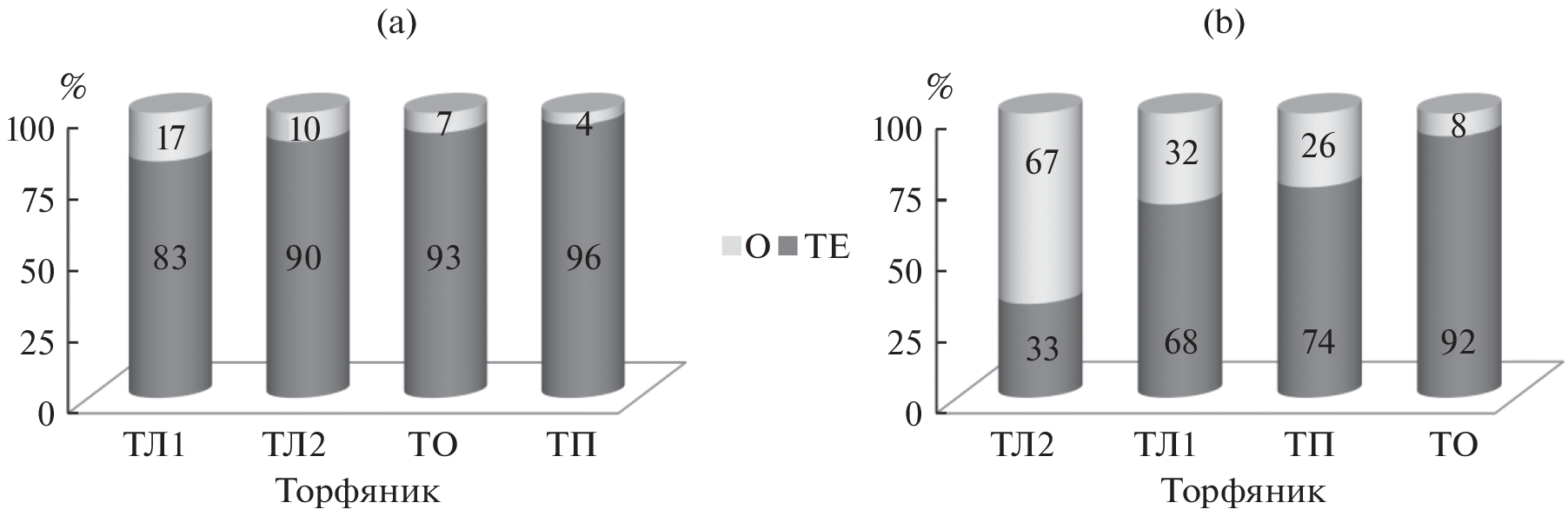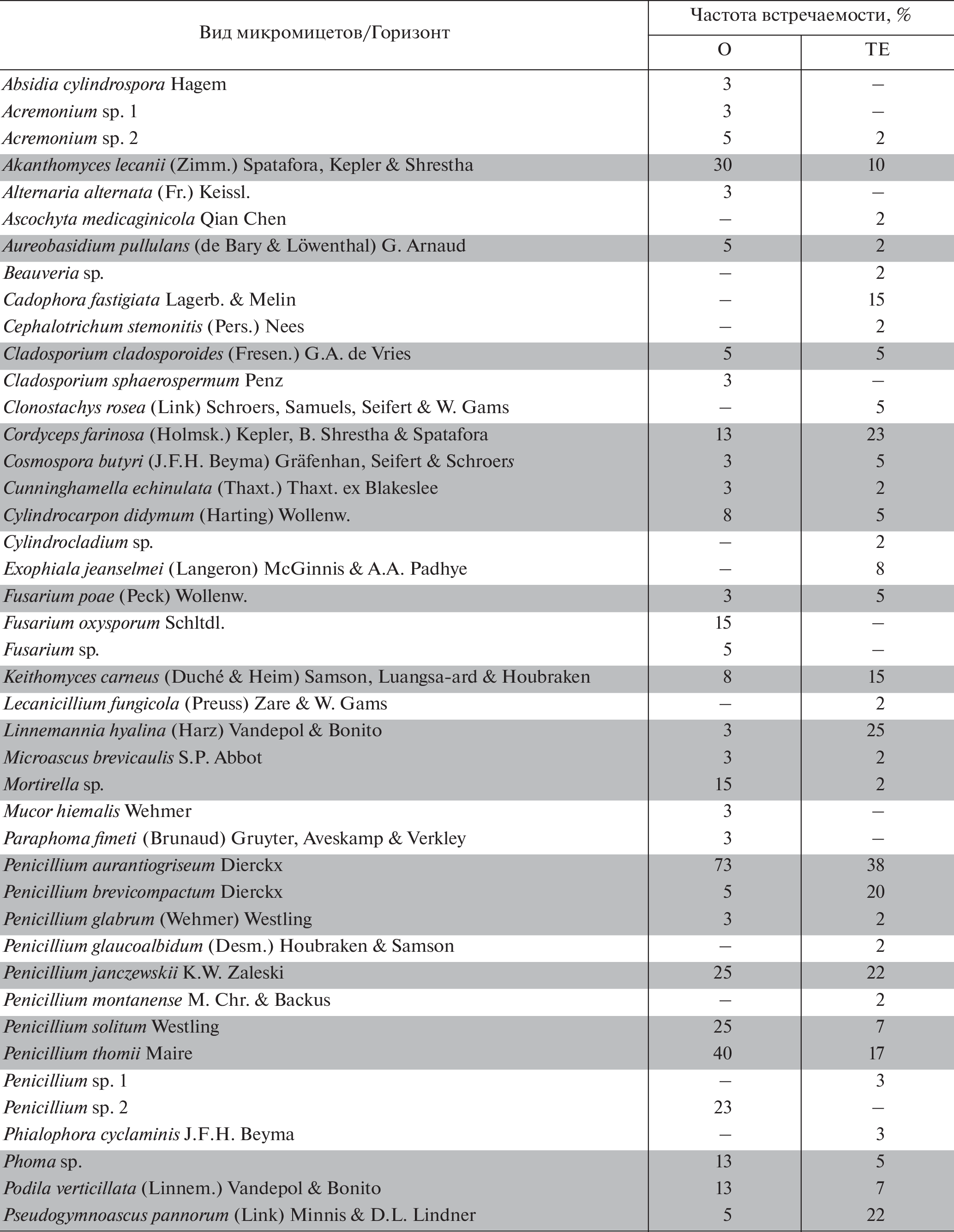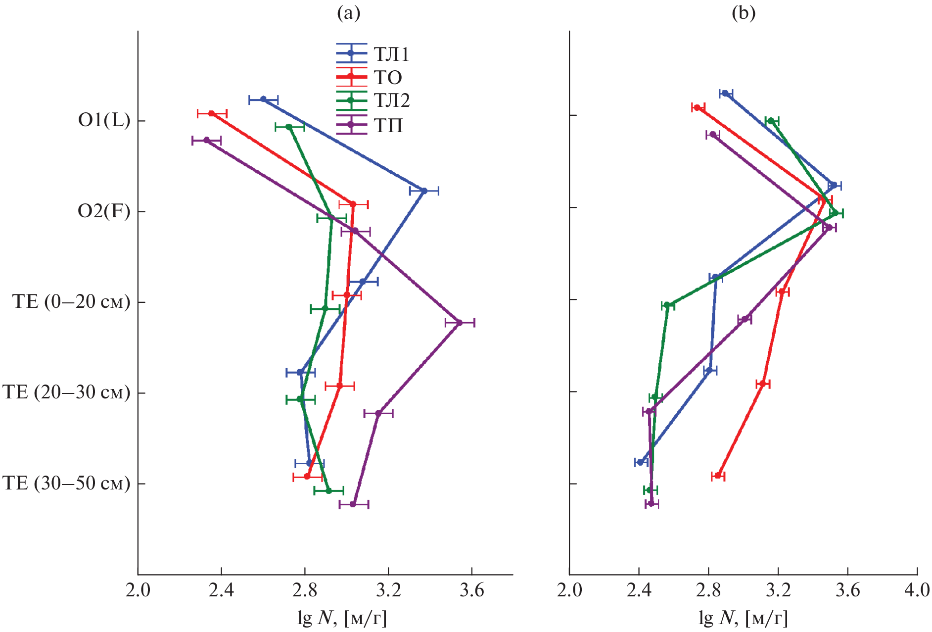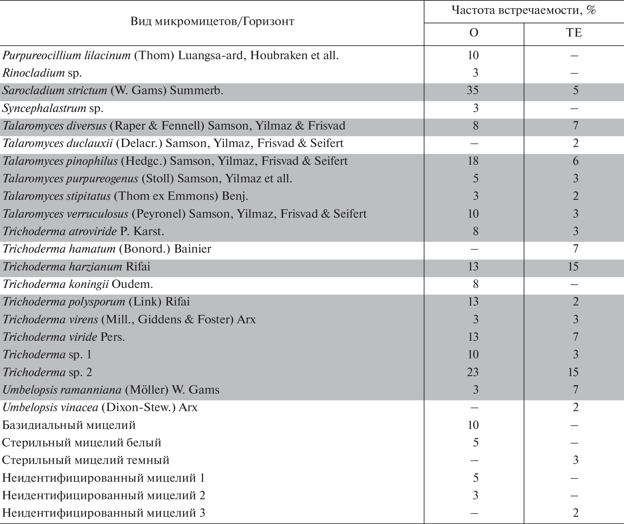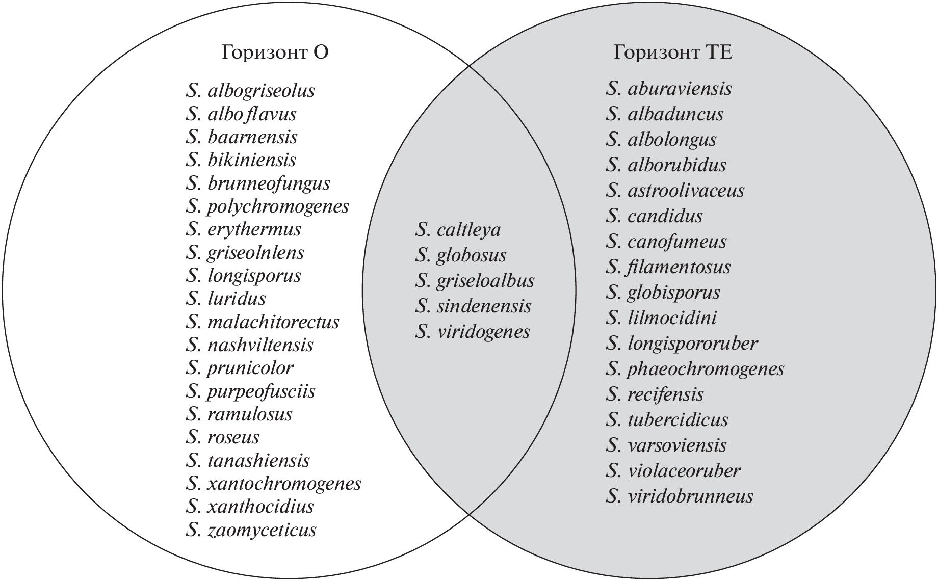 Проведен анализ структурных показателей (обилие, разнообразие) грибных и актиномицетных комплексов эутрофных торфяных почв в зоне основной деструкции органического детрита, представленной подстилкой (слоями L и F) и эутрофно-торфяным горизонтом (ТЕ). Образцы отбирали в заболоченных лесах Тверской и Томской областей (черноольшанник, сосняк, березняк, смешанный лес) в летний период 2021 г. Показатели обилия мицелиальных организмов выявляли люминесцентно-микроскопическим и чашечным методами. Видовую идентификацию культивируемых представителей проводили на основании фенотипических признаков. В подстилках по сравнению с эутрофно-торфяными горизонтами зафиксировано превышение длины грибного мицелия в 2‒10 раз, численности культивируемых грибов на 2‒3 порядка и актиномицетов на 1‒2 порядка. Ферментативный слой подстилки характеризовался максимальным содержанием углерода мицелиального компонента (3‒10 мг С/г). Запасы актиномицетной биомассы в зоне основной деструкции органического детрита исследуемых почв варьировали от 23 до 60 кг/га, грибной ‒ от 1593 до 3718 кг/га. Доля подстилки в профильном запасе мицелиальной биомассы была более весома в лиственных лесах. Из зоны основной деструкции органического детрита исследуемых почв было выделено 70 видов культивируемых грибов из 43 родов и 42 вида актиномицетов из 12 серий и 4 секций. В грибном комплексе преобладали представители родов Penicillium, Talaromyces, Trichoderma, в актиномицетном ‒ рода Streptomyces. Подстилки не уступали эутрофно-торфяному горизонту по видовому разнообразию грибов и актиномицетов. Видовое сходство комплексов грибов подстилок и горизонта ТЕ ‒ 0.68, комплексов актиномицетов ‒ 0.27.