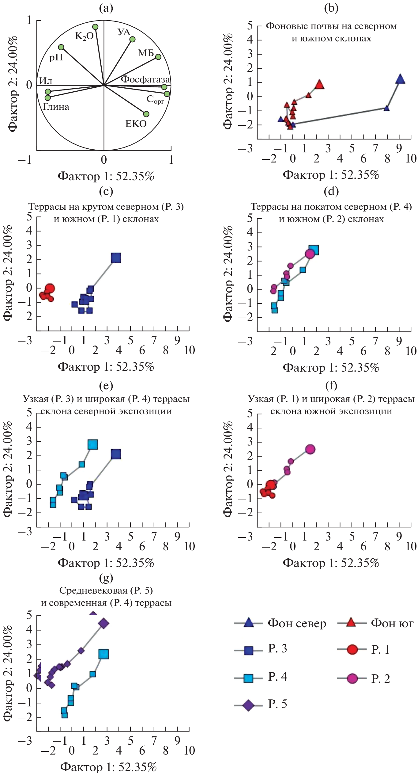 The article considers the chemical properties and biological activity of soils of agricultural terraces on clay shales in the mid-mountain zone of the Eastern Caucasus. It is established that the area of terraced plots in the southern zone of Shale Dagestan is about 264 km2 of the territory. These soils are currently in a fallow state but represent a significant reserve of highly fertile erosion-resistant soils, the cultivation of which, unlike soils on consolidated rocks, is possible with the help of modern technology. The influence of slope exposure, steepness, terrace size, duration of the plowing period on the chemical properties and biological activity of soils has been studied. It is shown that for background soils outside the terracing zone, the slope exposure has a decisive influence. For terraced areas, the impact of exposure is less pronounced. The formation of a vertical terraced surface led to a change in the thermal regime, as a result of which the differences in chemical and microbiological properties of soils on the slopes of the northern and southern exposures became less pronounced. The leveling effect of terracing is most noticeable on relatively gentle slopes (12°–18°), where the width of the terraced canvas is greatest. On steep slopes (>20°) with narrow terraces, the influence of slope exposure on soil properties remains. At the same time, factors such as the duration of soil functioning and the features of agricultural technology have no less significant impact on soil properties. The regularities of changes in soil properties within the body of any single terrace have been established. The most fertile area within one terrace is the instrument part, where the profile depth is greatest. As we approach the rear seam of the terrace, a natural decrease in a number of biological and chemical indicators is observed.