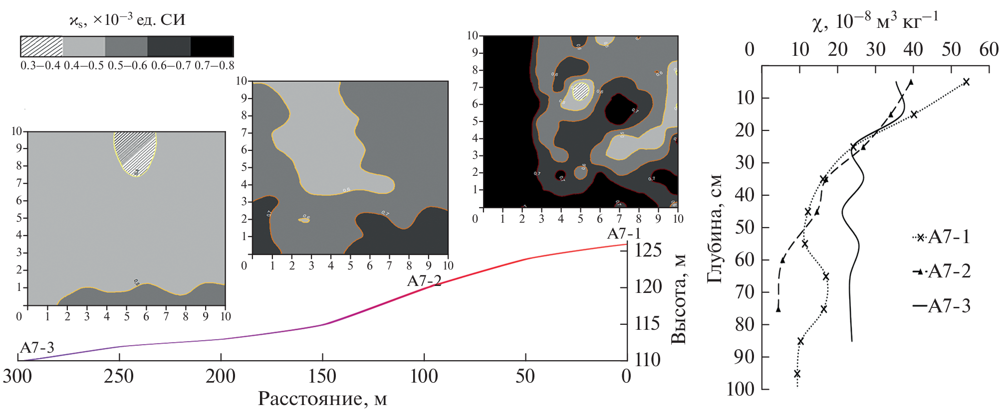 A comparative analysis of areal and profile measurements of magnetic susceptibility was carried out in order to improve methods of surface sensing of the earth, as well as to take into account small-scale mapping of soils and the identification of anomalies associated with anthropogenic pollution or violation of the surface layer of soils. Two sites with Haplic Chernozems and one Haplic Kastanozems (Endosalic, Cambic) were studied. Additionally, a catena was studied on the territory of the Ergeninsky upland with the inclusion of sites in various positions of the landscape (eluvial, transeluvial, transeluvial-accumulative). The comparison of the areal and profile magnetic susceptibility measured to a depth of 30 cm showed a direct correlation (R2 = 0.7). It was found that the areal type of survey correctly captures the volumetric magnetic susceptibility (\({{\varkappa }_{{\text{s}}}}\)) to a depth of 30 cm. The variation of \({{\varkappa }_{{\text{s}}}}\) at sites with different types of soils reflects soil-climatic zonality and spatial lithological heterogeneity, expressed in different granulometric and mineralogical composition of the 0–30 cm layer on an area of 10 × 10 m. The areal magnetic susceptibility of soils can be an important additional indicator capable of reflecting the features of soil-forming, lithological and landscape geochemical processes occurring in the upper soil layer. Variation of \({{\varkappa }_{{\text{s}}}}\) at sites in different positions of the landscape occurs under the influence of planar flushing and a change in the direction of iron oxidogenesis processes depending on the position of the soil profile in the relief. The complex of measurements of areal and profile magnetic susceptibility can be used to study soil inhomogeneities caused by anthropogenic, paleocryogenic, geomorphological and lithogenic factors. Such an approach can be widely applied to the study of polluted soils and monitoring of agricultural land.