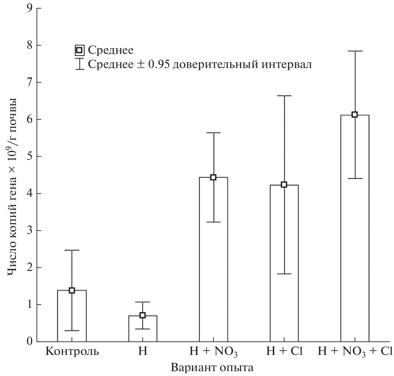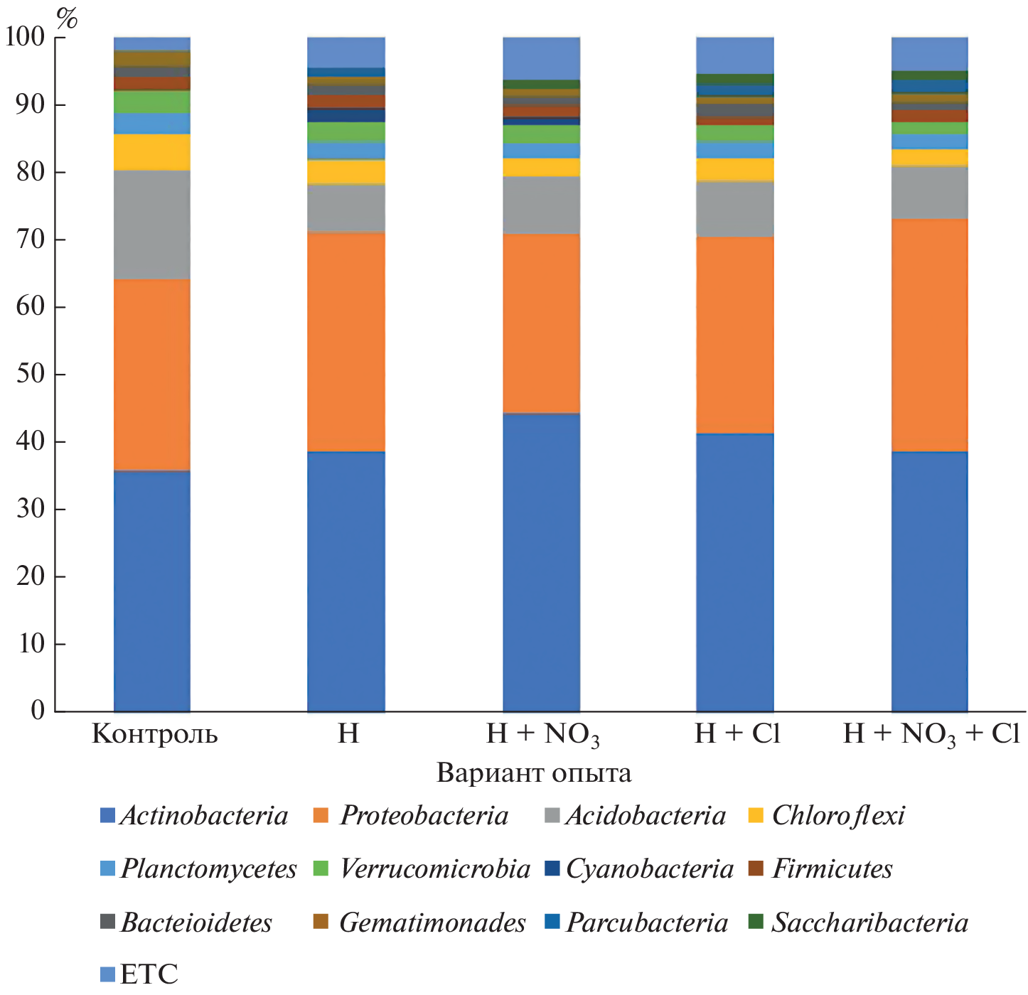 The effect of nitrate and potassium chloride salts, on the structure of the metabolically active prokaryotic community of oil-contaminated chernozem has been studied. Molecular biological approaches and bioinformatic methods of analysis were used in the study. The objects of the study were samples of chernozem selected in the Voronezh region (N 51°1′41″, E 40°43′31″). The phylogenetic and functional diversity of the prokaryotic complex of oil-contaminated chernozem was considered when introducing nitrate and potassium chloride under conditions of a slightly alkaline reaction of the medium. Contamination of chernozem with oil in an amount of 5% of the soil mass led to alkalinization of the medium from 7.1 to 7.9. The introduction of nitrate and potassium chloride, both separately and together in a total dose of 2 mmol/100 g of soil removed this negative effect. The combined addition of nitrate and potassium chloride led to a more than twofold increase in the biomass of metabolically active prokaryotic cells and the number of copies of functional genes responsible for the synthesis of alkanmonooxygenase enzymes involved in the decomposition of oil. In the presence of oil, the formation of a specific complex of bacteria was revealed, in which representatives of A-ctinobacteria (Rhodococcus erythropolis) and Alphaproteobacteria (Bradyrhizobium japonicum) prevailed. Rhodococcus erythropolis and Bradyrhizobium japonicum, being autochthonous organisms in uncontaminated soil, began to occupy dominant positions in oil-contaminated samples, and the introduction of nitrates enhanced this effect.