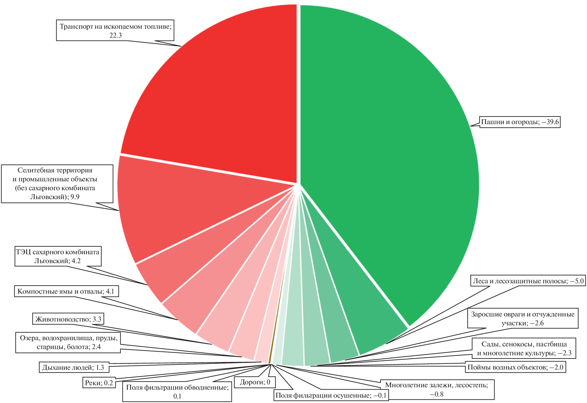 A comprehensive study of the net carbon balance of Lgov administrative district (Kursk oblast) in the Chernozem zone of the European part of Russia is carried out. The data sources included field estimates of carbon dioxide and methane exchange between soil and atmosphere, above- and below-ground phytomass stocks, simulation models parameterized on these data, official statistical and meteorological information, and published scientific data. Watered filtration fields of waste disposal sites of sugar industry are responsible for 26% of CH4 emissions from the territory of the district, although they occupy only 0.04% of its area. The maximum of CO2 emission is found at volumetric soil moisture of 30%, whereas, with exceeding this value, methane emission begins to rise linearly, reaching a maximum on the open surface of water reservoirs, and among them – on watered filtration fields. Another significant local source of methane is compost storages (22%). However, water reservoirs and ponds are the largest source of CH4 (43%). Amongst the net sources of CO2 the combustion of fossil fuels by transport and agriculture machinery predominates (22.3%). In contrast to methane, which emission is mainly determined by powerful point sources, the input of net fluxes of CO2 positively correlates with their area. Currently observed low rate net CO2 flux in the district area (–6.4 g C m–2 per year), is decisively overlapped by local methane sources (+95 g C (CO2-eq.) m–2 per year). The influence of the types of land use and methods of calculation on the C-balance of the territory in study, and a way of its transformation into a carbon-neutral state are discussed.