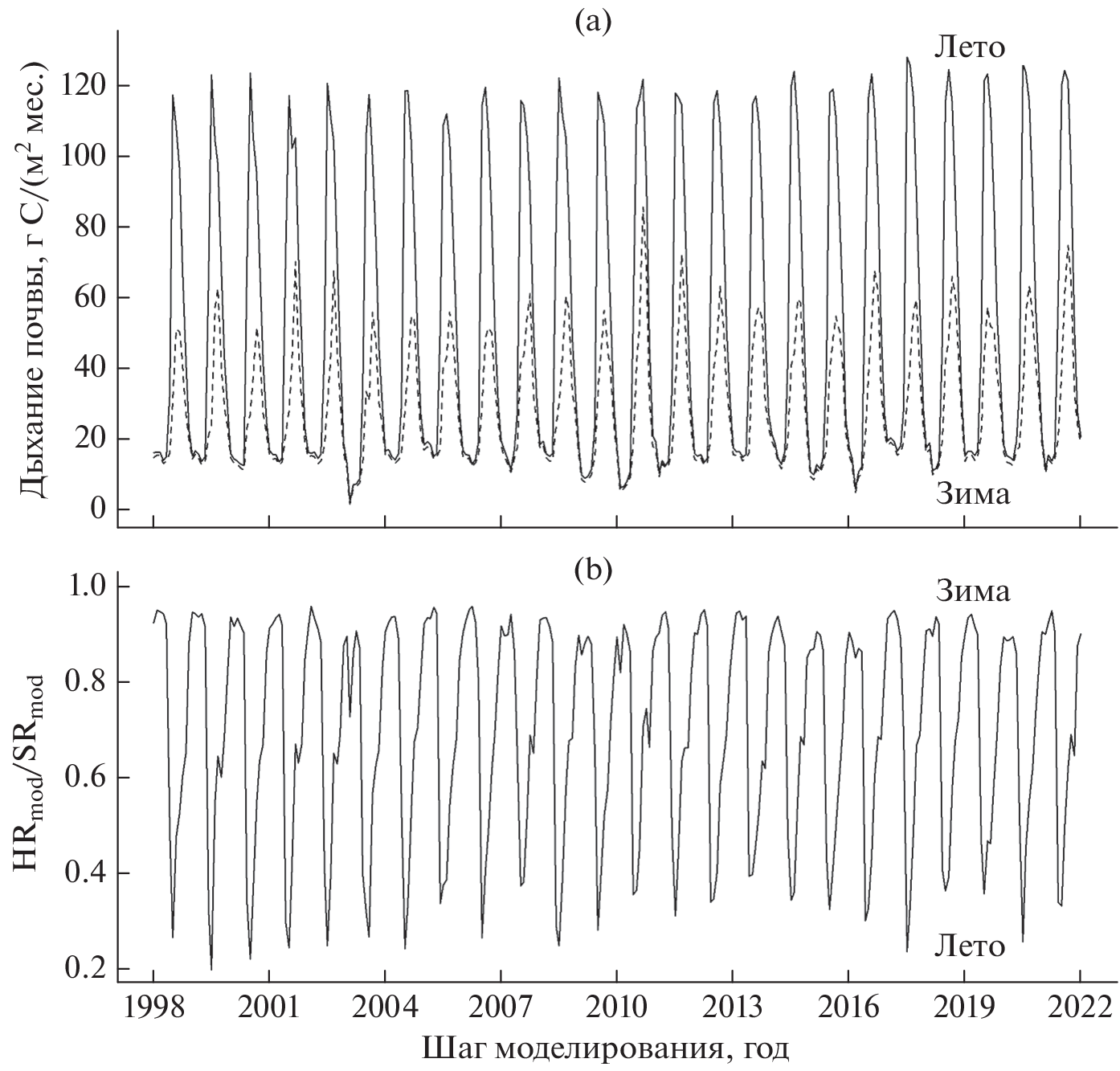 The paper considers the results of calculations of the heterotrophic (HR) and total soil respiration for Entic Carbic Podzol under a coniferous-broad-leaved forest in the South of the Moscow region (54.89° N, 37.56° E), performed using the soil model Romul_Hum and a new version of the system of models EFIMOD3. The results of soil respiration modeling had a good correlation with the field measurement data. The Romul_Hum model simulates better the intensity of HR of the studied soil in wet than in dry years when it lightly overestimates the HR values. In the spatially detailed modeling of heterotrophic and root respiration using the EFIMOD3, the variability of carbon pools and fluxes associated with the distribution of the litterfall and hydrothermal conditions under the forest canopy was taken into account. The data obtained show that the intensity of HR at the beginning and middle of the growing season differs by about a factor of two, and HR values between different parts of the simulation site at the same time differ by more than 3.5 times. Spatial and temporal variability of the soil respiration affects the accuracy of estimates of C stocks in forest ecosystems. The used models are effective tools to analyze changes in soil carbon stocks, soil respiration, and carbon sink estimation in forest ecosystems, including tasks of forest management.