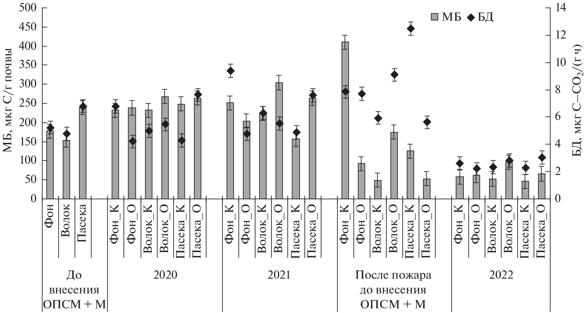 The biological activity of dark gray soil was studied in a 100-year-old pine forb-green-moss forest of the Pogorelsky pine forest of the Krasnoyarsk forest-steppe. In 2017, selective cuttings were carried out in the pine forest, and in May 2022 there was a strong fire. To improve reforestation and increase the biological productivity of the soil, bio-fertilizer based on sawdust-soil substrate with the addition of urea and mycoproduct (SSSU + M) was applied to cut and burned areas. On the experimental plots (Paseka, Volok, Fon), an annual count of self-seeding of pine was carried out. Bioindication of the soil condition was assessed based on the total number and ratio of ecological-trophic groups of microorganisms, enzyme activity, microbial biomass content, intensity of basal respiration and specific respiration of microbial biomass. The application of biofertilizer to the cut areas alkalized the soil by 0.2–0.4 units, retained moisture, increased the content of nitrogen (by 5–14%) and microbial biomass (by 1.2–1.6 times), compared with the control options. The impact of biofertilizers on the germination and growth of self-seeding of pine was noted in the second year after application – in the experimental plots of self-seeding it was 4–6 times greater than in the control ones. The entry of burnt plant residues, coals and ash into the soil in the first week after the fire led to an increase in some microbiological indicators, the activity of urease and invertase, and the activation of carbotrophic microorganisms. However, by the end of the growing season, a decrease in microbiological activity was noted, which indicated a post-pyrogenic depression of microbocenoses. The introduction of biofertilizer on the burnt surface of the plots leveled the effect of pyrogenic effects and stimulated the formation of shoots of scots pine, the number of which was significantly higher than in the control plots. It was found that the universal bioindicators that adequately reflect the state of the soil after all anthropogenic impacts were microbial biomass, specific microbial respiration, enzymatic activity and the total number of microorganisms. A specific bioindication of the soil condition after the fire was an increase in the proportion of bacteria Serratia plymuthica, Bacillus mycoides and fungi of the genera Trichoderma, Penicillium and Mortierela.