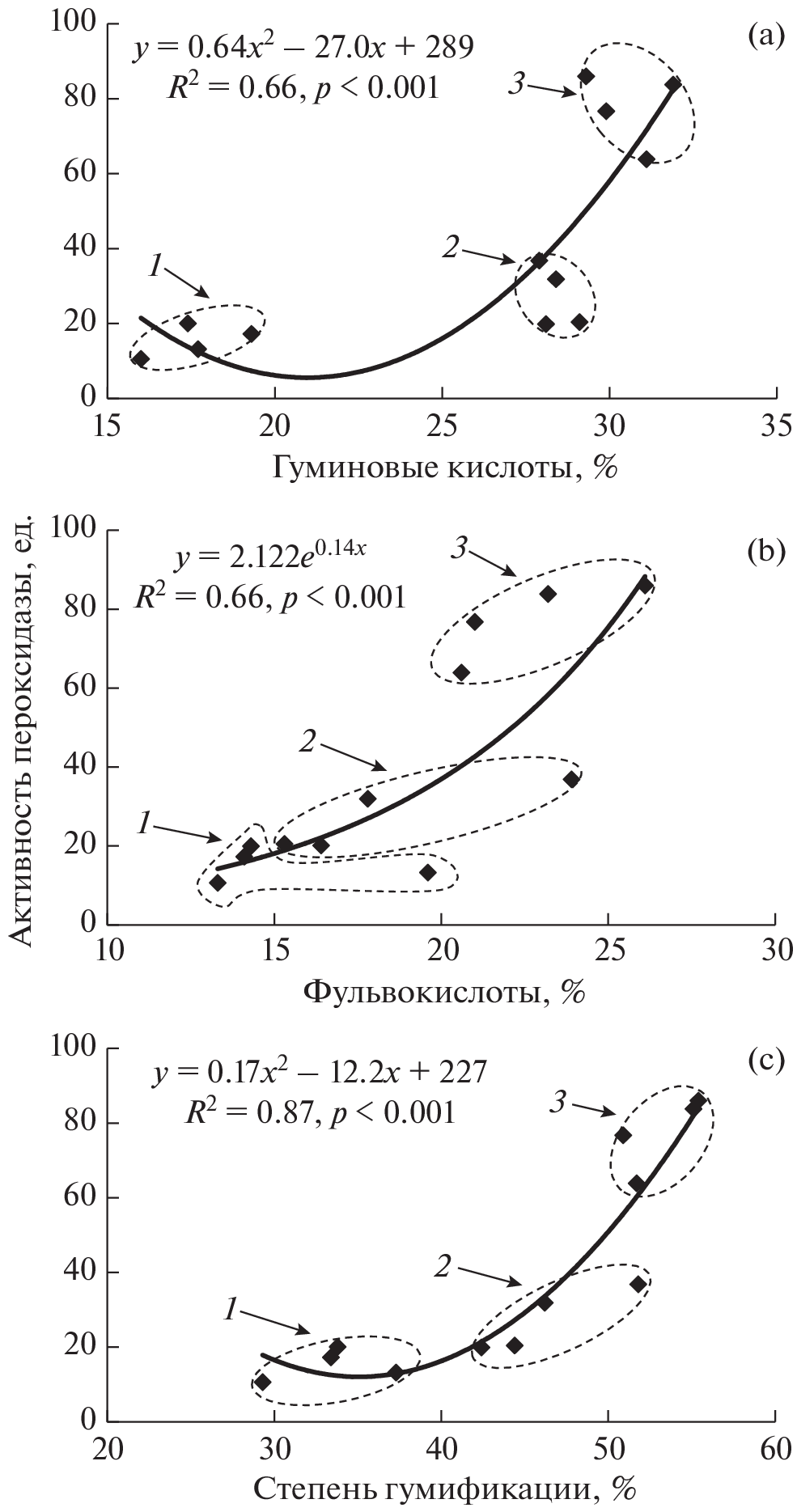 We studied a mesotrophic swamp drained 25 years ago, in the northern part of the Ob and Tom rivers (geographical coordinates 56°23′710″ N, 84°34′043″ E). In forest peat soils (0–30 cm), the weighted average of peroxidase activity for the season (base level) was in the mode of weak hydro reclamation 14.4, moderate – 21.9, intensive 70 units (ml I/g of abs. dry sample in 2 min). Second-order parabola is a most adequate function of the main trend of the development of seasonal fluctuations in peroxidase activity. Numerical values and signs of the parabolic trend parameters show that from June to October, the average peroxidase activity decreased weekly by 4.4, 7.6 and 15.2 units with weekly average acceleration by 0.31, 0.59 and 1.54 units in the mode of weak, moderate and intensive drainage, respectively. The seasonal wave of peroxidase activity relative to the baseline level is characterized by a June increase in growth rates, the maximum in the 0–10 cm layer. In July, there is a decrease in the growth rate according to the depth of reclamation: in the mode of weak and moderate drainage the process already covers the entire soil profile in August, in conditions of intensive drainage – in October. The enzyme activity is significantly positively related with soil bulk moisture and pH, negatively – with redox potential and multidirectionally – with soil temperature. Environmental conditions act as duplicate parameters when assessing their contribution to the seasonal dynamics of peroxidase, creating the effect of interchangeability of environmental gradients. Canonical determination indices approximate the cumulative impact of the discussed set by 52–74%, depending on the depth of reclamation. Canonical weights show that the main factor regulating the seasonal activity of peroxidase is the hydrothermal regime. According to canonical correlations, in conditions of weak drainage, to a greater extent under the influence of temperature, intensive – humidity, moderate drainage – humidity and temperature. The differentiated contribution of peroxidase activity in the formation of the humus state of peat soils of different degrees of drainage was revealed.